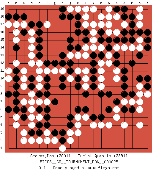 Last move : 0-1 2011 May 27 4:16:10 [Event "FICGS__GO__TOURNAMENT_DAN__000025"] [Site "FICGS"] [Date "2011.01.31"] [Round "1"] [Black "Groves,Don"] [White "Turlot,Quentin"] [Result "0-1"] [Rating 1 "2001"] [Rating 2 "2391"] 1.q16 d4 2.c16 q4 3.r6 o4 4.q9 k4 5.h3 k3 6.d3 c3 7.e3 c2 8.e4 d5 9.f6 d7 10.f8 f17 11.k17 c17 12.d17 d16 13.c18 b17 14.e16 d15 15.e17 b16 16.e15 d14 17.e14 d13 18.e13 d12 19.d9 e12 20.f12 f11 21.g12 g11 22.h12 e9 23.e8 d8 24.f9 e10 25.h9 r14 26.r15 q14 27.r12 p16 28.p17 o17 29.p15 o16 30.q15 q17 31.r17 p18 32.q18 m17 33.l16 n18 34.o14 l18 35.k18 n14 36.n13 m14 37.k6 s4 38.m5 m4 39.n5 n4 40.k14 o13 41.p13 p14 42.o15 o12 43.m12 s15 44.n15 m15 45.n16 m16 46.s16 s14 47.p12 n12 48.m13 p11 49.q11 p10 50.q19 s18 51.p17 s17 52.p19 o18 53.t16 q17 54.r18 s19 55.q10 n10 56.m11 n11 57.m10 n9 58.s13 n17 59.r16 o19 60.t14 m19 61.m9 q7 62.o8 r7 63.n8 k15 64.l15 l14 65.j15 k13 66.j14 k19 67.j18 j19 68.h19 l19 69.h18 s9 70.t15 j2 71.h2 h11 72.j11 l13 73.q6 p6 74.p7 s6 75.r8 s8 76.q8 s7 77.o6 p5 78.j4 j10 79.h10 k11 80.j12 l11 81.k10 l10 82.k9 l9 83.l8 e5 84.f5 k5 85.j5 l5 86.l6 d2 87.e6 d6 88.s10 e2 89.b18 g2 90.g3 f3 91.f4 f2 92.t9 t8 93.t10 h1 94.a18 a17 95.f10 j13 96.h13 l17 97.k16 e7 98.b10 f7 99.d10 e11 100.b8 c11 101.b6 b5 102.b14 b15 103.c6 c9 104.b9 c10 105.b11 b12 106.a6 c7 107.b7 a11 108.g7 j3 109.c5 b4 110.a8 a10 0-1 Here are the names of the openings (joseki) played in the four corners : Corner q4 : q4 r6 Hoshi (Hwajeom, Seongjeom, Xingwei`) 4-4 Point. The star or hoshi (4-4) point, emphasizing influence at the potential expense of territory. Ikken Kakari (Hankan Keolch'im, Yi Gua`jiao~, 1-Space Low Approach). Black 2 is the standard approach move to the 4-4. Corner d4 : d4 h3 Hoshi (Hwajeom, Seongjeom, Xingwei`) 4-4 Point. The star or hoshi (4-4) point, emphasizing influence at the potential expense of territory. Corner d16 : c16 f17 Komoku (Somok, Xiao~mu`) 3-4 Point. The komoku (3-4) point is the traditional corner enclosure move.. Niken Kakari (Dukan Keolch'im, E`r Gua`jiao~, 2-Space Low Approach). White 2 is used with friendly forces backing it up. Its purpose is to prevent a pincer. Locally it results in a loss, but may be appropriate fuseki strategy. It was popular in the late 1950s and early 1960s, but is not seen often nowadays, having been replaced by the one-space high approach, with which it has points in common. Corner q16 : q16 r14 Hoshi (Hwajeom, Seongjeom, Xingwei`) 4-4 Point. The star or hoshi (4-4) point, emphasizing influence at the potential expense of territory. Ikken Kakari (Hankan Keolch'im, Yi Gua`jiao~, 1-Space Low Approach). White 2 is the standard approach move to the 4-4. Player White won this Go (weiqi, baduk) game. Follow this game move after move (download)There are possible things, impossible things, and things that happen. Sometimes things happen that were impossible. (Pierre Audouard) Happy endings are just stories that haven't finished yet. (Jane Smith in Mr & Mrs Smith)