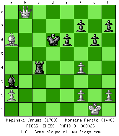 Last move : 1-0 2007 March 8 2:55:52 [Event "FICGS__CHESS__RAPID_B__000026"] [Site "FICGS"] [Date "2006.12.06"] [Round "1"] [White "Kepinski,Janusz"] [Black "Moreira,Renato"] [Result "1-0"] [WhiteElo "1700"] [BlackElo "1400"] 1.Nf3 d5 2.d4 g6 3.c4 Bg7 4.Nc3 Nf6 5.Bg5 c6 6.e3 O-O 7.Rc1 Bg4 8.Bxf6 Bxf6 9.cxd5 cxd5 10.Qb3 Bxf3 11.Qxb7 Nd7 12.gxf3 Nb6 13.Bg2 e6 14.O-O Bh4 15.Nb1 Nc4 16.b3 Nd6 17.Qc7 Nb5 18.Qxd8 Rfxd8 19.f4 Rdc8 20.Rc5 a6 21.Rfc1 Nd6 22.Nd2 Kf8 23.e4 Rxc5 24.dxc5 Nxe4 25.Nxe4 dxe4 26.Bxe4 Rc8 27.Bb7 Rc7 28.Bxa6 Bf6 29.b4 Bb2 30.Rc4 Ba3 31.c6 Ke7 32.b5 Kd6 33.b6 Rxc6 34.b7 Rxc4 35.b8Q+ 1-0 Reti Opening Kingside Castling by player Black (move 6) Kingside Castling by player White (move 14) Promotion Queen by player White (move 35) Player White won this chess game. Follow this game move after move (download)For me, Chess is life and every game is like a new life. Every Chess player gets to live many lives in one lifetime. (Eduard Gufeld) Du kannst im Schach nur gut werden, wenn du das Spiel liebst. (Robert James Fischer) Fischer era un maestro de claridad y un Rey del posicionamiento astuto. Sus oponentes podían ver hacia donde se dirigía pero eran impotentes para detenerlo. (Bruce Pandolfini) C'est une question de caractère, Beaucoup de gens perdent leur motivation très vite. D'autres, ils sont rares, peuvent la conserver très longtemps. J'aime les échecs, encore aujourd'hui je suis heureux d'analyser des parties. J'aime toujours gagner, je déteste encore perdre. Bien jouer est important pour mon intégrité intellectuelle et morale. Et puis les échecs vivent en ce moment une période historique grâce à Internet. Ils se développent dans les systèmes éducatifs à travers le monde. Ils sortent de leur ghetto, et c'est mon rôle de mener à bien cette révolution. (Gary Kasparov) War is the child of passion, passion is the child of narcissism and narcissism is the child. (...) Another game ? (Thibault de Vassal)