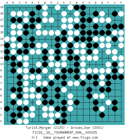 Last move : 0-1 2011 May 20 15:41:12 [Event "FICGS__GO__TOURNAMENT_DAN__000025"] [Site "FICGS"] [Date "2011.01.31"] [Round "1"] [Black "Turlot,Morgan"] [White "Groves,Don"] [Result "0-1"] [Rating 1 "2125"] [Rating 2 "2001"] 1.r16 d17 2.d15 c4 3.e4 r4 4.p3 l3 5.r6 q3 6.p4 q5 7.s3 p5 8.s4 p17 9.q2 r13 10.p16 o16 11.p15 q17 12.r15 c13 13.q12 g3 14.j3 e3 15.d3 d4 16.c3 b3 17.b2 b5 18.a3 f4 19.b4 e5 20.j5 l5 21.m4 l4 22.o5 l7 23.o6 j7 24.e14 g17 25.c17 c16 26.d16 c15 27.e17 d18 28.e18 c18 29.j17 l17 30.h16 e12 31.b6 r12 32.q11 r10 33.r11 s11 34.s9 q13 35.p13 p14 36.o14 q14 37.o15 p12 38.o13 f16 39.e16 g15 40.j14 g13 41.g16 c9 42.c5 r9 43.s10 s12 44.r8 p11 45.q10 q9 46.p10 q8 47.r7 t10 48.s8 f15 49.f17 r17 50.o10 s15 51.s16 t15 52.n16 t13 53.s14 g18 54.h18 h15 55.j16 j15 56.o17 g19 57.f19 k18 58.j18 k16 59.k15 k17 60.h19 l15 61.k14 l14 62.l13 k13 63.j13 k12 64.j12 m13 65.l12 k11 66.j11 m12 67.l11 k10 68.m11 n11 69.m10 n10 70.m9 n9 71.m8 o11 72.m14 m15 73.n14 m17 74.n18 j10 75.g11 h10 76.g12 f13 77.g10 g9 78.f9 f10 79.b17 b18 80.d13 d11 81.c14 b16 82.k8 b14 83.c12 h8 84.k7 k6 85.g6 d14 86.e13 f12 87.c14 b13 88.d12 h11 89.c10 c11 90.b11 d10 91.b10 b12 92.k19 l19 93.m19 j19 94.j6 h17 95.k9 f8 96.e7 f7 97.f6 e6 98.h7 d7 99.j8 o9 100.p7 r14 101.t16 t14 102.e9 e8 103.b9 d9 104.c8 n12 105.h2 g2 106.c7 j4 107.h4 h3 108.k4 j2 109.k2 h1 110.k3 h12 111.m16 l16 112.n17 m18 113.n19 e2 114.k1 q7 115.q6 c1 116.p8 p9 117.b1 d2 118.c2 n8 119.n7 m7 120.o8 d5 121.c6 j9 122.l9 g7 123.g5 t18 124.p18 d1 125.a12 b15 126.a13 q18 127.s18 a14 128.a11 t9 129.t8 t11 130.j1 h2 131.q15 d8 132.n15 n13 133.o12 d6 134.g4 f5 135.pass pass 0-1 Here are the names of the openings (joseki) played in the four corners : Corner d16 : d17 d15 Komoku (Somok, Xiao~mu`) 3-4 Point. The komoku (3-4) point is the traditional corner enclosure move.. Ikken Takagakari (Hankan Nop'dakeolch'im, Yi Gaogua`jiao~, 1-Space High Approach). The 5-4 approach move has become more popular in modern times, as modern Go emphasizes speed and influence. Corner d4 : c4 e4 Komoku (Somok, Xiao~mu`) 3-4 Point. The komoku (3-4) point is the traditional corner enclosure move.. Ikken Takagakari (Hankan Nop'dakeolch'im, Yi Gaogua`jiao~, 1-Space High Approach). The 5-4 approach move has become more popular in modern times, as modern Go emphasizes speed and influence. Corner q4 : r4 p3 Komoku (Somok, Xiao~mu`) 3-4 Point. The komoku (3-4) point is the traditional corner enclosure move.. Ikken Kakari (Hankan Keolch'im, Yi Gua`jiao~, 1-Space Low Pincer). The small knight move is the basic approach move to the 3-4 point stone. It has been continually used for over four centuries. There are limitless variations, with new moves constantly being discovered. Black 2 opens the door to a treaure store of joseki. Corner q16 : r16 p17 Komoku (Somok, Xiao~mu`) 3-4 Point. The komoku (3-4) point is the traditional corner enclosure move.. Ikken Kakari (Hankan Keolch'im, Yi Gua`jiao~, 1-Space Low Pincer). The small knight move is the basic approach move to the 3-4 point stone. It has been continually used for over four centuries. There are limitless variations, with new moves constantly being discovered. White 2 opens the door to a treaure store of joseki. Player White won this Go (weiqi, baduk) game. Follow this game move after move (download)You can hide nothing on the goban. (Pierre Audouard) Life is like a ten-speed bicycle: most of us have gears we never use. (Charles M. Schulz)