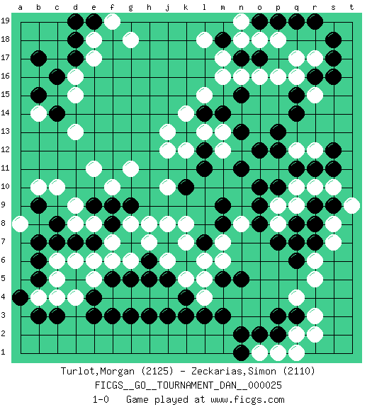 Last move : 1-0 2011 March 24 12:6:19 [Event "FICGS__GO__TOURNAMENT_DAN__000025"] [Site "FICGS"] [Date "2011.01.31"] [Round "1"] [Black "Turlot,Morgan"] [White "Zeckarias,Simon"] [Result "1-0"] [Rating 1 "2125"] [Rating 2 "2110"] 1.r16 d16 2.q3 d4 3.r9 p16 4.q14 r17 5.s17 q17 6.s18 m17 7.f3 j4 8.f5 d6 9.l3 l5 10.m5 m6 11.n5 l4 12.m3 f7 13.h6 h8 14.k6 l6 15.k3 k7 16.j7 j8 17.l7 k8 18.m8 n8 19.m9 g4 20.g5 m7 21.k4 k5 22.j5 h4 23.h5 f4 24.e4 e5 25.e3 h7 26.j3 j6 27.h3 f6 28.g3 r12 29.q11 r15 30.q15 q16 31.s16 q12 32.p12 p11 33.p13 q10 34.r11 r10 35.s11 s10 36.p10 o11 37.s12 p9 38.o10 q9 39.n11 l15 40.o12 d13 41.o8 r5 42.r7 q7 43.q6 r6 44.q8 s7 45.r8 s8 46.s9 p8 47.p7 t9 48.q7 r3 49.o9 q4 50.p3 r2 51.d17 e17 52.c16 d15 53.d18 e18 54.b15 b14 55.b17 k12 56.c8 c10 57.b6 c5 58.b9 b10 59.b5 b4 60.b7 a8 61.e9 e11 62.d7 c6 63.e7 e6 64.c3 c4 65.f8 d9 66.g7 g8 67.g9 f10 68.f9 g11 69.b3 g6 70.a4 d8 71.c7 e8 72.o17 o16 73.n17 m16 74.m18 l18 75.p19 p18 76.q19 o18 77.o19 n19 78.r19 n18 79.e19 f19 80.d19 g18 81.k10 j10 82.k13 l13 83.l12 j12 84.l14 m13 85.m14 k14 86.n13 m12 87.n15 n16 88.l11 j13 89.c14 o1 90.o2 p1 91.n1 q2 92.p2 q1 93.n2 1-0 Here are the names of the openings (joseki) played in the four corners : Corner q16 : r16 p16 Komoku (Somok, Xiao~mu`) 3-4 Point. The komoku (3-4) point is the traditional corner enclosure move.. Ikken Takagakari (Hankan Nop'dakeolch'im, Yi Gaogua`jiao~, 1-Space High Approach). The 5-4 approach move has become more popular in modern times, as modern Go emphasizes speed and influence. Corner d4 : d4 f3 Hoshi (Hwajeom, Seongjeom, Xingwei`) 4-4 Point. The star or hoshi (4-4) point, emphasizing influence at the potential expense of territory. Ikken Kakari (Hankan Keolch'im, Yi Gua`jiao~, 1-Space Low Approach). Black 2 is the standard approach move to the 4-4. Player Black won this Go (weiqi, baduk) game. Follow this game move after move (download)Eyes win semiais. (Anonymous) True nature is revealed in times of difficulty. (Chinese proverb)