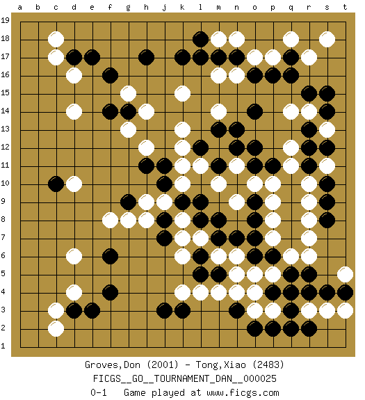 Last move : 0-1 2011 February 25 0:9:26 [Event "FICGS__GO__TOURNAMENT_DAN__000025"] [Site "FICGS"] [Date "2011.01.31"] [Round "1"] [Black "Groves,Don"] [White "Tong,Xiao"] [Result "0-1"] [Rating 1 "2001"] [Rating 2 "2483"] 1.q16 d4 2.q3 d16 3.f16 d14 4.d17 c17 5.e17 c18 6.k17 r14 7.r15 q14 8.o16 r10 9.f4 d6 10.d3 c3 11.e3 c2 12.k3 d10 13.r5 r7 14.p6 r17 15.s15 p17 16.p16 o17 17.n17 n18 18.m17 m18 19.l18 s18 20.f14 g15 21.g14 n16 22.o14 m16 23.l17 m14 24.n13 k15 25.l12 k13 26.j11 h12 27.h17 h14 28.h11 g13 29.f6 p3 30.p2 q4 31.p4 o3 32.o2 r3 33.q2 p5 34.r4 o4 35.o6 l4 36.l6 k4 37.j3 m6 38.m7 q6 39.q5 n6 40.n7 o5 41.o8 m4 42.n3 n4 43.m5 n5 44.r12 q12 45.r11 q11 46.s10 r9 47.s14 p9 48.o9 s3 49.s4 r6 50.t4 t5 51.p4 p7 52.o7 q4 53.r2 t3 54.p4 k6 55.q4 l7 56.s9 o10 57.l8 k7 58.n10 p8 59.s8 r8 60.o11 p10 61.p11 n11 62.o12 n9 63.m8 m10 64.k9 k10 65.j10 m12 66.m13 l11 67.n12 k12 68.m11 k11 69.n10 s13 70.r13 n11 71.q17 q18 72.n10 s11 73.s12 n11 74.c10 k8 75.l9 j9 76.j8 h9 77.g9 h8 78.j7 g8 79.l5 f8 0-1 Here are the names of the openings (joseki) played in the four corners : Corner d16 : d16 f16 Hoshi (Hwajeom, Seongjeom, Xingwei`) 4-4 Point. The star or hoshi (4-4) point, emphasizing influence at the potential expense of territory. Ikken Takagakari (Hankan Nop'dakeolch'im, Yi Gaojia, 1-Space High Approach). White typically responds at 6-4 or 3-10. White 4-10 is played when White finds play on the right side advantageous. White 4-8 or 3-8 may be played when White has support at top. Corner q16 : q16 r14 Hoshi (Hwajeom, Seongjeom, Xingwei`) 4-4 Point. The star or hoshi (4-4) point, emphasizing influence at the potential expense of territory. Ikken Kakari (Hankan Keolch'im, Yi Gua`jiao~, 1-Space Low Approach). White 2 is the standard approach move to the 4-4. Corner d4 : d4 f4 Hoshi (Hwajeom, Seongjeom, Xingwei`) 4-4 Point. The star or hoshi (4-4) point, emphasizing influence at the potential expense of territory. Ikken Takagakari (Hankan Nop'dakeolch'im, Yi Gaojia, 1-Space High Approach). White typically responds at 6-4 or 3-10. White 4-10 is played when White finds play on the right side advantageous. White 4-8 or 3-8 may be played when White has support at top. Player White won this Go (weiqi, baduk) game. Follow this game move after move (download)More haste less speed. (John Fairbairn) There will be no order, only chaos. (Sol Robeson in Pi by Darren Aronofsky)