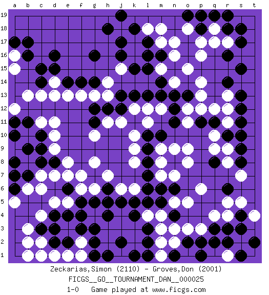 Last move : 1-0 2011 March 28 7:5:45 [Event "FICGS__GO__TOURNAMENT_DAN__000025"] [Site "FICGS"] [Date "2011.01.31"] [Round "1"] [Black "Zeckarias,Simon"] [White "Groves,Don"] [Result "1-0"] [Rating 1 "2110"] [Rating 2 "2001"] 1.r16 q4 2.d16 c4 3.r6 p6 4.q8 p16 5.m16 p14 6.r14 r17 7.s17 q17 8.s15 d14 9.c14 c13 10.c15 k17 11.l15 m18 12.j16 k16 13.k15 j15 14.j17 j18 15.h18 l18 16.g16 h14 17.j19 n17 18.k18 d10 19.e4 g4 20.e6 c6 21.c3 b3 22.d3 b2 23.g3 h3 24.h4 j3 25.g5 j4 26.f4 j6 27.l17 o8 28.l7 k8 29.n8 o9 30.m10 q10 31.r3 r4 32.q3 p3 33.p2 o3 34.o2 m3 35.r10 r11 36.q11 r9 37.s10 q9 38.s9 r8 39.s8 q12 40.s11 r12 41.s12 k10 42.n11 l12 43.k11 l11 44.l10 k9 45.n13 j11 46.p11 o12 47.n12 o11 48.o13 p12 49.l13 n9 50.l8 m9 51.l9 b13 52.c8 d7 53.c10 d11 54.d8 e7 55.b7 b6 56.b9 d9 57.b11 e8 58.a10 f6 59.h6 h7 60.g7 g6 61.h5 g8 62.f5 f7 63.g14 f2 64.g2 e1 65.d2 d1 66.c1 c2 67.e2 f1 68.f3 b1 69.d4 g13 70.f14 f13 71.e14 e13 72.d15 d13 73.j13 n2 74.s4 s5 75.s3 r5 76.n4 o1 77.q2 n3 78.h12 h13 79.j12 k12 80.k13 a16 81.b17 s7 82.g11 h11 83.g12 g10 84.r18 q18 85.s18 s2 86.t2 n16 87.n15 p13 88.b16 a15 89.a17 m8 90.l5 m4 91.m5 n5 92.n6 o5 93.p1 h2 94.g1 c1 95.n1 m1 96.q19 p19 97.r19 a12 98.c9 c11 99.a11 m7 100.m6 k6 101.l6 r1 102.r2 o15 103.p18 o18 104.o19 n14 105.m14 p17 106.p19 m15 107.h1 m12 108.m13 t4 109.s1 m17 110.l16 r13 111.s13 j1 112.k4 k3 113.j5 l4 114.k5 d5 115.l2 a7 116.a8 c7 117.a6 a5 118.a7 n7 119.k1 k2 120.l1 m2 121.j2 e5 122.l3 1-0 Here are the names of the openings (joseki) played in the four corners : Corner q4 : q4 r6 Hoshi (Hwajeom, Seongjeom, Xingwei`) 4-4 Point. The star or hoshi (4-4) point, emphasizing influence at the potential expense of territory. Ikken Kakari (Hankan Keolch'im, Yi Gua`jiao~, 1-Space Low Approach). Black 2 is the standard approach move to the 4-4. Corner q16 : r16 p16 Komoku (Somok, Xiao~mu`) 3-4 Point. The komoku (3-4) point is the traditional corner enclosure move.. Ikken Takagakari (Hankan Nop'dakeolch'im, Yi Gaogua`jiao~, 1-Space High Approach). The 5-4 approach move has become more popular in modern times, as modern Go emphasizes speed and influence. Corner d16 : d16 d14 Hoshi (Hwajeom, Seongjeom, Xingwei`) 4-4 Point. The star or hoshi (4-4) point, emphasizing influence at the potential expense of territory. Ikken Takagakari (Hankan Nop'dakeolch'im, Yi Gaojia, 1-Space High Approach). Black typically responds at 6-4 or 3-10. Black 4-10 is played when Black finds play on the right side advantageous. Black 4-8 or 3-8 may be played when Black has support at top. Corner d4 : c4 e4 Komoku (Somok, Xiao~mu`) 3-4 Point. The komoku (3-4) point is the traditional corner enclosure move.. Ikken Takagakari (Hankan Nop'dakeolch'im, Yi Gaogua`jiao~, 1-Space High Approach). The 5-4 approach move has become more popular in modern times, as modern Go emphasizes speed and influence. Player Black won this Go (weiqi, baduk) game. Follow this game move after move (download)The poor player plays the opponent's game for him. (Anonymous) I'll be back. (Arnold Schwarzenegger)