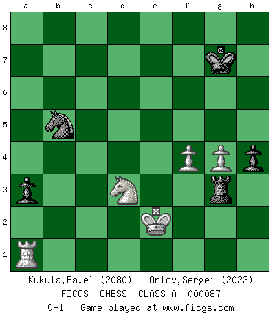 Last move : 0-1 2011 May 13 19:32:54 [Event "FICGS__CHESS__CLASS_A__000087"] [Site "FICGS"] [Date "2011.01.31"] [Round "1"] [White "Kukula,Pawel"] [Black "Orlov,Vladimir"] [Result "0-1"] [WhiteElo "2080"] [BlackElo "2023"] 1.d4 Nf6 2.c4 e6 3.g3 d5 4.Nf3 Bb4+ 5.Bd2 Be7 6.Bg2 O-O 7.O-O c6 8.Qc2 Nbd7 9.Bf4 b6 10.Rd1 Ba6 11.b3 Rc8 12.Nc3 h6 13.e4 dxc4 14.Nd2 b5 15.bxc4 bxc4 16.Bf1 Nb6 17.a4 Bb4 18.a5 Nbd7 19.Bxc4 Bb5 20.Rdb1 Bxa5 21.Bd6 Re8 22.e5 Nd5 23.Nce4 Bxd2 24.Nxd2 a5 25.Qd3 a4 26.Bxb5 cxb5 27.Rxb5 Rc3 28.Qb1 Qa8 29.Ne4 Qc6 30.Ra5 Rc4 31.Bc5 Nxc5 32.Rxc5 Rxc5 33.dxc5 Ra8 34.Ra3 Nc7 35.Qd3 Qd5 36.Qxd5 exd5 37.Nd6 Kf8 38.f4 Ke7 39.Kf2 f6 40.exf6+ Kxf6 41.Ke3 Ke6 42.Kd3 Kd7 43.Nf5 Ne6 44.Kc3 h5 45.Ra2 g6 46.Nh4 Nxc5 47.Nxg6 Ne4+ 48.Kd3 Ke6 49.Ne5 Rb8 50.Kc2 Rb4 51.Ra3 Nd6 52.Ra1 Nb5 53.Nd3 Rc4+ 54.Kd2 a3 55.h3 Kf6 56.g4 h4 57.Ke3 Rc3 58.Kd2 d4 59.Rc1 Kg7 60.Rb1 Nd6 61.Ke2 Rc2+ 62.Kf3 Rh2 63.Nf2 d3 64.Nxd3 Rxh3+ 65.Ke2 Rg3 66.Ra1 Nb5 0-1 Catalan Opening Kingside Castling by player Black (move 6) Kingside Castling by player White (move 7) 10 pieces endgame at move 64 : White KRNPP , Black KRNPP WHITE : King + 1 Rook 1 Knight 2 Pawns BLACK : King + 1 Rook 1 Knight 2 Pawns Player Black won this chess game. Follow this game move after move (download)Morphy was probably the greatest genius of them all. (Bobby Fischer) Gewöhnliche Menschen denken nur daran, wie sie ihre Zeit verbringen. Ein intelligenter Mensch versucht, sie auszunutzen. (Arthur Schopenhauer) Siempre es mejor sacrificar los hombres de tu oponente. (Savielly Tartakower) Le jeu d'échecs fait naître et fortifie en nous plusieurs qualités précieuses dans le cours de l'existence, telles que la prévoyance, la circonspection, la prudence, et la persévérance. (Benjamin Franklin - 1783, la morale des échecs) The quality of decision is like the well-timed swoop of a falcon which enables it to strike and destroy its victim. (Sun Tzu)