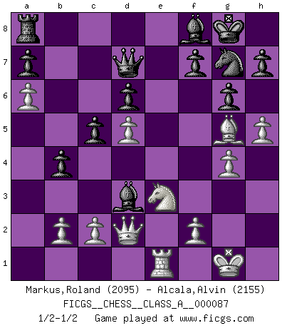 Last move : 1/2-1/2 2011 July 28 8:55:3 [Event "FICGS__CHESS__CLASS_A__000087"] [Site "FICGS"] [Date "2011.01.31"] [Round "1"] [White "Markus,Roland"] [Black "Alcala,Alvin"] [Result "1/2-1/2"] [WhiteElo "2095"] [BlackElo "2155"] 1.Nc3 c5 2.Nf3 d6 3.e3 g6 4.d4 Nd7 5.a4 Ngf6 6.a5 Bg7 7.d5 O-O 8.e4 b6 9.a6 Ne8 10.Bd3 Nc7 11.O-O Nf6 12.Re1 Bd7 13.Bf4 Nh5 14.Be3 b5 15.Qc1 Bg4 16.Nd2 b4 17.Nb5 Bd7 18.Nxc7 Qxc7 19.Nc4 e6 20.Qd2 exd5 21.exd5 Rfe8 22.h4 Bf8 23.Bg5 Rxe1+ 24.Rxe1 Bb5 25.Ne3 Qd7 26.g4 Ng7 27.h5 Bxd3 1/2-1/2 Dunst (Sleipner, Heinrichsen) Opening Kingside Castling by player Black (move 7) Kingside Castling by player White (move 11) This chess game ended in a draw. Follow this game move after move (download)Chess, like love, like music, has the power to make people happy. (Siegbert Tarrasch) Computer sind die einzigen Gegner, die nicht immer eine Ausrede auf Lager haben, wenn sie gegen mich verlieren. (Robert James Fischer) El Ajedrez es imaginación. (David Bronstein) Les échecs, c'est l'art d'analyser. (Mikhail Botvinnik) Chess is everything: art, science and sport. (Anatoly Karpov)