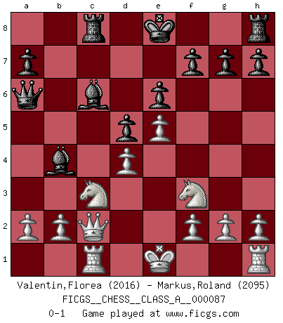 Last move : 0-1 2011 June 11 7:26:1 [Event "FICGS__CHESS__CLASS_A__000087"] [Site "FICGS"] [Date "2011.01.31"] [Round "1"] [White "Valentin,Florea"] [Black "Markus,Roland"] [Result "0-1"] [WhiteElo "2016"] [BlackElo "2095"] 1.e4 c6 2.d4 d5 3.e5 c5 4.dxc5 Nc6 5.Bb5 e6 6.Be3 Nge7 7.c3 Bd7 8.Bxc6 Bxc6 9.Nf3 Nf5 10.Bd4 Nxd4 11.cxd4 b6 12.cxb6 Qxb6 13.Qc2 Bb4+ 14.Nc3 Qa6 15.Rc1 Rc8 0-1 Caro-Kann : Advance variation Player Black won this chess game. Follow this game move after move (download)Up to this point White has been following well-known analysis. But now he makes a fatal error: he begins to use his own head. (Siegbert Tarrasch) Jeder Fehler erscheint unglaublich dumm, wenn andre ihn begehen. (Georg Christoph Lichtenberg) Un mal día en el Ajedrez, es mejor que cualquier buen día en el trabajo. (Anonymous) Toutes choses étant égales, c'est la conviction qui gagne. Alliée à une volonté de vaincre, elle sert de détonateur, suscite des idées, disperse les doutes et aide à penser clairement. (Robert Fischer) A journey of a thousand sites begins with a single click. (Author unknown)