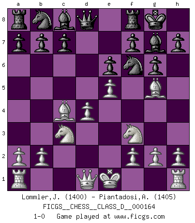 Last move : 1-0 2011 February 12 23:32:57 [Event "FICGS__CHESS__CLASS_D__000164"] [Site "FICGS"] [Date "2011.02.02"] [Round "1"] [White "Lommler,Jan Peter"] [Black "Piantadosi,Angelo"] [Result "1-0"] [WhiteElo "1400"] [BlackElo "1405"] 1.Nf3 Nf6 2.c4 g6 3.d4 d5 4.Nc3 Bg7 5.Bg5 dxc4 6.e4 O-O 7.Bxc4 e6 8.e5 1-0 Reti Opening Kingside Castling by player Black (move 6) Player White won this chess game. Follow this game move after move (download)Nothing excites jaded Grandmasters more than a theoretical novelty. (Dominic Lawson) Versuche, dich von der Sklaverei der Eröffnungsvarianten zu befreien. Stattdessen soll man gewisse Typenpositionen erlernen, die man eingehend analysiert. (Aaron Nimzowitsch) El jugador táctico sabe que hacer cuando hay algo que hacer; mientras que el estratega sabe que hacer cuando no hay nada que hacer. (Gerald Abrahams) Assurément je connaissais par expérience le mystérieux attrait de ce jeu royal, le seul entre tous les jeux inventés par les hommes qui échappe souverainement à la tyrannie du hasard, le seul où l'on ne doive sa victoire qu'à son intelligence ou plutôt à une certaine forme d'intelligence. Mais n'est-ce pas déjà le limiter injurieusement que d'appeler les échecs un jeu ? N'est-ce pas une science, un art ou quelque chose qui, comme le cercueil de Mahomet entre ciel et terre, est suspendu entre l'un et l'autre, et qui réunit un nombre incroyable de contraires ? [...] C'est une pensée qui ne mène à rien, une mathématique qui n'établit rien, un art qui ne laisse pas d'uvre, une architecture sans matière; et il l'a prouvé néanmoins qu'il était plus durable, à sa manière, que les livres ou que tout autre monument, ce jeu unique qui appartient à tous les peuples et à tous les temps, et dont personne ne sait quel dieu en fit don à la terre pour tuer l'ennui, pour aiguiser l'esprit et stimuler l'âme. Où commence-t-il, où finit-il ? (Stefan Zweig) Real knowledge is to know the extent of one's ignorance. (Confucius)