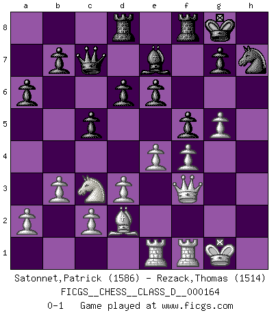 Last move : 0-1 2011 June 8 7:13:43 [Event "FICGS__CHESS__CLASS_D__000164"] [Site "FICGS"] [Date "2011.02.02"] [Round "1"] [White "Satonnet,Patrick"] [Black "Rezack,Thomas"] [Result "0-1"] [WhiteElo "1586"] [BlackElo "1514"] 1.e4 c5 2.f4 d6 3.Nf3 Bg4 4.Bb5+ Nd7 5.Nc3 a6 6.Bxd7+ Qxd7 7.h3 Bxf3 8.Qxf3 e6 9.d3 Be7 10.O-O Nf6 11.Bd2 O-O 12.Rae1 Qc7 13.b3 Rad8 14.g4 h6 15.h4 Nh7 16.g5 hxg5 17.hxg5 f5 0-1 This chess game has been lost on time (started : 2011.02.02 16:20:30) Sicilian : Grand Prix attack Kingside Castling by player White (move 10) Kingside Castling by player Black (move 11) Player Black won this chess game. Follow this game move after move (download)The blunders are all there on the board, waiting to be made. (Savielly Tartakover) Der zweitbeste Zug ist oft der einzig richtige. (Savielly Grigorievitsch Tartakower) Si tu oponente te ofrece un empate, trata de averiguar porque piensa él que esta en una posición peor. (Nigel Short) Le profane ne songe pas à la somme de jouissance dont il se prive, qui méconnaît ce jeu aux ressources aussi variées que passionnantes. (Jean-Marie Jeanton-Lamarche) Men never do evil so completely and cheerfully as when they do it from religious conviction. (Blaise Pascal)