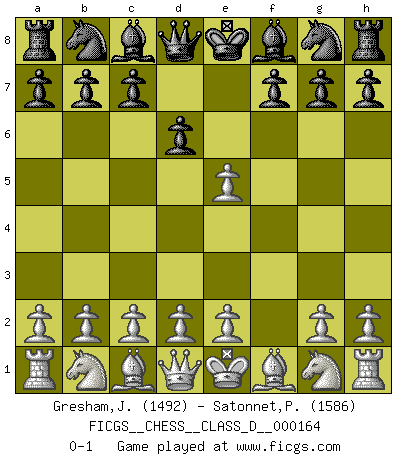 Last move : 0-1 2011 March 18 12:27:53 [Event "FICGS__CHESS__CLASS_D__000164"] [Site "FICGS"] [Date "2011.02.02"] [Round "1"] [White "Gresham,Jonathan"] [Black "Satonnet,Patrick"] [Result "0-1"] [WhiteElo "1492"] [BlackElo "1586"] 1.f4 e5 2.fxe5 d6 0-1 This chess game has been lost on time (started : 2011.02.02 16:20:30) Bird : From gambit Player Black won this chess game. Follow this game move after move (download)Kasparov : J'adoube , Ivanchuk : S'il vous plaît ! (Garry Kasparov & Vassily Ivanchuk, Linares 1997) Die Jungen erwarten, dass Opa einfach umfällt. Dann aber kann Opa fünf Stunden lang Schach spielen und die jungen Gegner an die Wand drücken. (Viktor Kortschnoi) Morphy probablemente fue el genio más grande de todos. (Bobby Fischer) Le temps de noter son nom sur la feuille de partie, j'étais déjà en zeitnot ! D'un modeste amateur apparié lors de la première ronde d'un open contre le grand-maître Azmaïparashvili. The question of whether computers can think is just like question of whether submarines can swim. (Edsger W. Dijkstra)