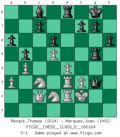 Last move : 0-1 2011 May 4 11:56:4 [Event "FICGS__CHESS__CLASS_D__000164"] [Site "FICGS"] [Date "2011.02.02"] [Round "1"] [White "Rezack,Thomas"] [Black "Marques,Joao"] [Result "0-1"] [WhiteElo "1514"] [BlackElo "1402"] 1.e4 e5 2.Nf3 Nc6 3.Bb5 a6 4.Ba4 b5 5.Bb3 Bb7 6.c3 Nf6 7.Bc2 Be7 8.O-O O-O 9.Re1 d6 10.d4 exd4 11.cxd4 Nb4 12.Nc3 Re8 13.a3 Nxc2 14.Qxc2 Bf8 15.Bg5 Be7 16.Rad1 Ng4 17.Bxe7 Rxe7 18.Ng5 h6 19.Nf3 Qd7 20.Rd3 Rae8 21.h3 Nf6 22.Rde3 Qc6 23.d5 Qd7 24.Nd2 Bc8 25.b4 Nh5 26.Rf1 Re5 27.f3 Nf4 28.Rfe1 Nxh3+ 29.gxh3 Qxh3 30.R1e2 Rg5+ 31.Kf2 Qg3+ 0-1 Ruy Lopez : Caro variation Kingside Castling by player White (move 8) Kingside Castling by player Black (move 8) Player Black won this chess game. Follow this game move after move (download)The mistakes are there, waiting to be made. (Savielly Tartakower) Es genügt nicht ein guter Spieler zu sein, man muß auch gut spielen. (Siegbert Tarrasch) Una mala movida nulifica cuarenta buenas. (Horowitz) J'ai toujours senti une vague pitié pour l'homme qui ne connaît rien aux échecs, tout comme j'en aurais pour un homme ignorant de l'amour. Les Echecs, comme la musique ou comme l'amour, ont le pouvoir de rendre heureux. (Siegbert Tarrasch) Memory... is the diary that we all carry with us. (Oscar Wilde, The Importance of Being Earnest)