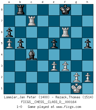 Last move : 1-0 2011 May 4 11:56:14 [Event "FICGS__CHESS__CLASS_D__000164"] [Site "FICGS"] [Date "2011.02.02"] [Round "1"] [White "Lommler,Jan Peter"] [Black "Rezack,Thomas"] [Result "1-0"] [WhiteElo "1400"] [BlackElo "1514"] 1.Nf3 d5 2.d4 Nf6 3.c4 e6 4.Nc3 h6 5.e3 Bb4 6.Be2 c5 7.O-O O-O 8.dxc5 Bxc5 9.Qb3 dxc4 10.Qxc4 Bb6 11.Rd1 Qe7 12.b3 a6 13.a4 Nc6 14.Ba3 Qe8 15.Nd2 Ne7 16.Rac1 Bd7 17.Qb4 Ned5 18.Nxd5 Nxd5 19.Qxf8+ Qxf8 20.Bxf8 Kxf8 21.Nf3 f6 22.Bc4 Bc6 23.Nd4 Bxd4 24.Rxd4 h5 25.Bxd5 Bxd5 26.Rc7 Rb8 27.f3 Bxb3 28.R4d7 e5 29.a5 Be6 30.Rxg7 b5 31.Rg6 Bc4 32.Rxf6+ 1-0 Reti Opening Kingside Castling by player White (move 7) Kingside Castling by player Black (move 7) Player White won this chess game. Follow this game move after move (download)A Chess game is a dialogue, a conversation between a player and his opponent. Each move by the opponent may contain threats or be a blunder, but a player cannot defend against threats or take advantage of blunders if he does not first ask himself: What is my opponent planning after each move ? (Bruce A. Moon) Meine Liebe ist Schach, Schach, Schach. Ich muss jeden Tag Schach spielen, deshalb fühle ich mich so stark. (Miguel Najdorf) El Ajedrez es el juego mas altamente simbólico, pero las agresiones estan por lo tanto aún mas francamente representadas en la partida. Tal vez comenzo como un juego de guerra; Algo como la representación de una batalla en miniatura entre las fuerzas de dos reinos. (Karl Meninger) Vous savez, camarade Pachman, je n'éprouve pas de plaisir à être ministre, je jouerais plutôt aux échecs comme vous, ou alors ferais une révolution au Venezuela. (Che Guevara à Ludek Pachman, 'Checkmate in Prague', 1975) Creativity is allowing yourself to make mistakes. Art is knowing which ones to keep. (Scott Adams)