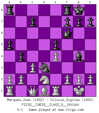 Last move : 0-1 2011 March 3 11:50:35 [Event "FICGS__CHESS__CLASS_D__000164"] [Site "FICGS"] [Date "2011.02.02"] [Round "1"] [White "Marques,Joao"] [Black "Vilnius,Sigitas"] [Result "0-1"] [WhiteElo "1402"] [BlackElo "1400"] 1.e4 e5 2.Nf3 Nc6 3.Bb5 Nf6 4.O-O d6 5.Re1 a6 6.Ba4 b5 7.Bb3 Bg4 8.c3 Be7 9.d3 O-O 10.Bg5 Nh5 11.Bxe7 Qxe7 12.Nbd2 Nf4 13.Bc2 b4 14.Qc1 a5 15.d4 Qf6 16.dxe5 Nxe5 17.Nxe5 dxe5 18.Bd1 Nd3 0-1 Ruy Lopez : Berlin defense, 4.O-O, d6 Kingside Castling by player White (move 4) Kingside Castling by player Black (move 9) Player Black won this chess game. Follow this game move after move (download)Without error there can be no brilliancy. (Emanuel Lasker) Fischer: 'Remis!?' Uhlmann: 'Aber es muss doch dreimal Zugwiederholung sein!' Fischer: 'Sie nehmen das Remis an, wie ich es sage, sonst spiele ich weiter und werde Sie dann schlagen!' (Robert James Fischer) Aunque la mayoría de la gente disfruta observar las partidas de los grandes Maestros de ataque, algunos de los jugadores mas notables en la historia han sido los jugadores silenciosos posicionales. Lentamente ellos te aplastan despojandote de tu espacio, congestionando tus piezas y dejandote virtualmente sin nada que hacer. (Yasser Seirawan) Des combinaisons [dans le jeu d'échecs] pareilles à des mélodies. Je crois entendre pour ainsi dire la musique des coups... (Vladimir Nabokov) Nobody is always a winner, and anybody who says he is, is either a liar or doesn't play poker. (Amarillo Slim)