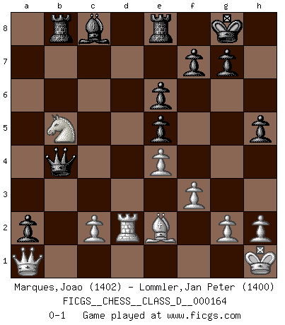 Last move : 0-1 2011 April 14 12:14:56 [Event "FICGS__CHESS__CLASS_D__000164"] [Site "FICGS"] [Date "2011.02.02"] [Round "1"] [White "Marques,Joao"] [Black "Lommler,Jan Peter"] [Result "0-1"] [WhiteElo "1402"] [BlackElo "1400"] 1.e4 c5 2.Nf3 d6 3.d4 cxd4 4.Nxd4 Nf6 5.Nc3 a6 6.Be2 e6 7.Be3 Be7 8.O-O O-O 9.Qd2 Nc6 10.Nb3 b5 11.f3 Ne5 12.a3 Qc7 13.Rad1 Rb8 14.Bg5 Nc4 15.Qc1 Nxa3 16.Kh1 Nc4 17.Rd4 Re8 18.Rfd1 h6 19.Bh4 Ng4 20.Bg3 Nce3 21.R1d2 Ne5 22.Bxe5 dxe5 23.R4d3 Nc4 24.Rd1 Bg5 25.Qb1 h5 26.Rf1 a5 27.Rfd1 a4 28.Nd2 Bxd2 29.R3xd2 Nxd2 30.Rxd2 a3 31.Nxb5 Qa5 32.b4 a2 33.Qa1 Qxb4 0-1 Sicilian : Najdorf, Opovcensky variation Kingside Castling by player White (move 8) Kingside Castling by player Black (move 8) Player Black won this chess game. Follow this game move after move (download)If you aren't afraid of Spassky, then I have removed the element of money. (Jim Slater) Wie gewinnt Tal? Er entwickelt alle seine Figuren in die Brettmitte und opfert sie dann irgendwo. (Robert James Fischer) Un sacrificio se refuta mucho mejor al aceptarlo. (Wilhelm Steinitz) La vie est comme un jeu d'échecs : nous esquissons un plan, mais celui-ci est tributaire de ce que daignent faire l'adversaire aux échecs et le destin dans la vie. (Arthur Schopenhauer) A person who never made a mistake never tried anything new. (Albert Einstein)