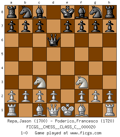 Last move : 1-0 2007 February 11 22:0:11 [Event "FICGS__CHESS__CLASS_C__000020"] [Site "FICGS"] [Date "2006.12.06"] [Round "1"] [White "Repa,Jason"] [Black "Poderico,Francesco"] [Result "1-0"] [WhiteElo "1700"] [BlackElo "1720"] 1.e4 d5 2.exd5 Qxd5 3.Nc3 Qd6 4.Nf3 1-0 This chess game has been lost on time (started : 2006.12.06 16:13:10) Scandinavian : Pytel-Wade variation Player White won this chess game. Follow this game move after move (download)Chess is a terrific way for kids to build self image and self esteem. (Saudin Robovic) Ein Remis kann durch Wiederholung von drei Zügen oder durch einen schlechte Zug erreicht werden. (Savielly Grigorievitsch Tartakower) Bendita sea la memoria de aquel que dio al mundo este juego inmortal. (A. G. Gardiner) Les échecs c'est le défi de l'alpiniste, toujours plus haut, prêt à tout pour monter à l'assaut du Roi ennemi. Les échecs, c'est de la musique en mouvement, un ballet majestueux pour les yeux. C'est de la poésie composée par les fantômes du passé qui au même titre que Rimbaud ou Verlaine méritent notre admiration. Les échecs, c'est de la peinture ou le moindre mouvement modifie le tableau pour en faire un Picasso ou un Van Gogh. Les échecs, c'est tout et rien, c'est la vie et la mort. Jjulie33 sur le forum de France-Echecs. Optimism is a variety of information deficit. Sometimes especially true for correspondence chess games. (Michael Aigner)