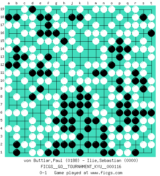 Last move : 0-1 2011 June 10 13:6:46 [Event "FICGS__GO__TOURNAMENT_KYU__000116"] [Site "FICGS"] [Date "2011.02.04"] [Round "1"] [Black "von Buttlar,Paul"] [White "Ilie,Sebastian"] [Result "0-1"] [Rating 1 "0188"] [Rating 2 "0000"] 1.k16 d4 2.e5 e4 3.f4 f5 4.g5 f6 5.f7 g6 6.h6 g4 7.e6 h5 8.f3 g7 9.h4 h3 10.j4 f8 11.e7 g3 12.j5 e8 13.g5 f2 14.h7 g8 15.e3 d3 16.e2 e1 17.d2 c2 18.c4 d5 19.g2 d1 20.h2 j3 21.k3 q4 22.j2 d16 23.f3 f4 24.d6 c6 25.d7 c7 26.d8 d9 27.c8 b8 28.c9 c10 29.b9 a9 30.b10 b11 31.k6 a10 32.j7 q16 33.l2 q10 34.g1 k10 35.k1 m17 36.b1 k17 37.l15 j16 38.f1 e3 39.h5 l16 40.k15 m15 41.m14 n14 42.l13 n13 43.k13 j15 44.j14 h14 45.j13 h13 46.l5 j12 47.m13 m12 48.l4 l12 49.k12 k11 50.k9 j9 51.k8 l9 52.k7 m7 53.l8 m8 54.l7 m6 55.m5 n5 56.n4 o5 57.n3 o4 58.m2 o3 59.n2 o2 60.o1 p1 61.n1 q2 62.h8 h9 63.n11 n12 64.o12 o11 65.m9 l10 66.m11 n10 67.n9 o9 68.j10 h10 69.n8 m10 70.p10 p11 71.p9 o8 72.n7 o7 73.n15 m16 74.p6 n6 75.q6 r8 76.q8 r7 77.r6 r9 78.p7 p8 79.q7 q9 80.s6 s7 81.r4 r3 82.q5 s4 83.r5 s5 84.p4 q3 85.b5 b3 86.h12 j11 87.o14 q13 88.p13 q12 89.p14 q15 90.r11 q11 91.q14 r14 92.p15 p16 93.o16 o17 94.n17 n16 95.n18 o15 96.p17 p18 97.q17 r17 98.q18 r18 99.o18 q19 100.g13 g14 101.h15 k14 102.l14 k14 103.h11 g11 104.g12 f12 105.f13 e13 106.f14 f15 107.e14 d14 108.c3 b4 109.c5 b6 110.a5 a6 111.b2 a4 112.p17 q17 113.m18 l18 114.l19 k19 115.m19 o19 116.f11 e15 117.r1 q1 118.s3 s2 119.t3 t2 120.r13 r12 121.s13 s12 122.r15 s14 123.t15 t13 124.s16 s17 125.t17 t18 126.t4 t5 127.t6 t7 128.e2 d2 129.t16 s15 130.s3 t3 131.g16 g17 132.f17 h17 133.f16 d17 134.f18 g18 135.g19 h19 136.j18 f19 137.e18 d18 138.k18 n19 139.e12 d12 140.e11 f10 141.f13 g12 142.d11 c12 143.s10 s11 144.e9 e10 145.c13 c14 146.b14 b15 147.b12 d13 148.b13 a14 149.d19 c18 150.b18 c19 151.s19 r16 152.l19 m19 153.a12 a11 154.p2 p3 155.s18 r19 156.t19 t18 157.c17 b17 158.b16 c16 159.r10 t10 160.e16 g15 161.s9 t9 162.a16 a17 163.s18 t14 164.t16 t17 165.d8 d7 166.a18 a15 0-1 Here are the names of the openings (joseki) played in the four corners : Corner d4 : d4 e5 Hoshi (Hwajeom, Seongjeom, Xingwei`) 4-4 Point. The star or hoshi (4-4) point, emphasizing influence at the potential expense of territory. Corner q4 : q4 l2 Hoshi (Hwajeom, Seongjeom, Xingwei`) 4-4 Point. The star or hoshi (4-4) point, emphasizing influence at the potential expense of territory. Player White won this Go (weiqi, baduk) game. Follow this game move after move (download)A meijin needs no joseki. (Anonymous) Lamb in skin of tiger, still fears the wolf. (Chinese proverb)