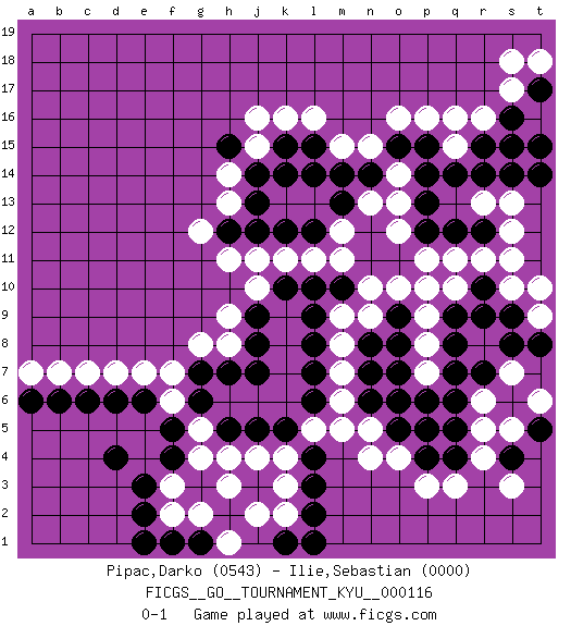 Last move : 0-1 2011 June 7 14:14:22 [Event "FICGS__GO__TOURNAMENT_KYU__000116"] [Site "FICGS"] [Date "2011.02.04"] [Round "1"] [Black "Pipac,Darko"] [White "Ilie,Sebastian"] [Result "0-1"] [Rating 1 "0543"] [Rating 2 "0000"] 1.d4 q3 2.q4 r4 3.q5 r5 4.q6 r6 5.q7 p3 6.r7 f3 7.f5 g5 8.f4 g4 9.e3 f2 10.e2 h3 11.p4 o4 12.o5 n5 13.n6 o6 14.p5 n4 15.o7 m6 16.n7 f6 17.e6 e7 18.d6 d7 19.c6 q15 20.l6 m7 21.l7 m8 22.n8 l5 23.l8 m9 24.l9 n9 25.o9 o10 26.p10 p9 27.o8 p7 28.p6 p8 29.o6 q10 30.r9 p11 31.r10 r11 32.q9 s10 33.s9 s11 34.q8 p10 35.s6 s5 36.t5 s7 37.s8 t6 38.s4 s3 39.m10 n10 40.q12 q11 41.r12 t9 42.t8 t10 43.g6 f7 44.g7 g8 45.h7 h8 46.j7 h11 47.k5 k4 48.j5 j4 49.h5 m11 50.l10 l11 51.j8 j10 52.j9 h9 53.k10 k11 54.p12 o12 55.p13 o13 56.p14 n15 57.o15 o16 58.p15 p16 59.r15 r16 60.q14 q16 61.s15 s13 62.s16 s17 63.t17 s18 64.s14 r13 65.r14 s12 66.t14 t16 67.t15 t18 68.l4 m5 69.l3 k2 70.l2 k3 71.k1 j2 72.l1 h4 73.g1 g2 74.f1 h1 75.e1 c7 76.b6 b7 77.a6 a7 78.n14 o14 79.m14 m15 80.l14 k16 81.l15 l16 82.k15 j15 83.j14 h14 84.j13 h13 85.j12 j11 86.h12 g12 87.l12 m12 88.m13 k13 89.k12 l13 90.k14 n13 91.h15 j16 0-1 Here are the names of the openings (joseki) played in the four corners : Corner q4 : q3 q4 Komoku (Somok, Xiao~mu`) 3-4 Point. The komoku (3-4) point is the traditional corner enclosure move.. Corner d4 : d4 f3 Hoshi (Hwajeom, Seongjeom, Xingwei`) 4-4 Point. The star or hoshi (4-4) point, emphasizing influence at the potential expense of territory. Ikken Kakari (Hankan Keolch'im, Yi Gua`jiao~, 1-Space Low Approach). White 2 is the standard approach move to the 4-4. Player White won this Go (weiqi, baduk) game. Follow this game move after move (download)The second line is the line of defeat, the third line is the line of territory, and the fourth line is the line of influence. (Anonymous) If everyone is thinking alike, then somebody isn't thinking. (US General George S. Patton)