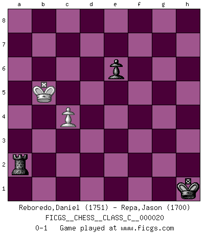 Last move : 0-1 2007 July 2 16:11:57 [Event "FICGS__CHESS__CLASS_C__000020"] [Site "FICGS"] [Date "2006.12.06"] [Round "1"] [White "Reboredo,Daniel"] [Black "Repa,Jason"] [Result "0-1"] [WhiteElo "1751"] [BlackElo "1700"] 1.e4 e6 2.d4 d5 3.Nc3 Nf6 4.Bg5 Bb4 5.e5 h6 6.Bd2 Bxc3 7.bxc3 Ne4 8.Qg4 g6 9.Bd3 Nxd2 10.Kxd2 c5 11.Nf3 Bd7 12.dxc5 Qa5 13.Qb4 Nc6 14.Qxa5 Nxa5 15.Nd4 Rc8 16.Nb3 Nc4+ 17.Bxc4 dxc4 18.Nd4 Rxc5 19.f4 g5 20.g3 Rg8 21.Rhg1 Ke7 22.Ne2 Rd5+ 23.Ke3 Ra5 24.Kd2 gxf4 25.gxf4 Rxg1 26.Nxg1 Bc6 27.Ke3 f6 28.Kd4 fxe5+ 29.fxe5 Rd5+ 30.Kxc4 Rxe5 31.Kb3 Rb5+ 32.Ka3 Rg5 33.Ne2 Rg2 34.Nd4 Rxh2 35.Nxc6+ bxc6 36.Rb1 a5 37.Ka4 Rh5 38.c4 Rf5 39.Rb7+ Kf6 40.Rh7 h5 41.Rc7 h4 42.Rxc6 h3 43.Rd6 Ke5 44.Rd1 Kf4 45.Rd4+ Kg3 46.Rd3+ Kg2 47.Rd2+ Rf2 48.Rd8 h2 49.Rh8 h1Q 50.Rxh1 Kxh1 51.Kxa5 Rxc2 52.Kb5 Rxa2 0-1 French : MacCutcheon, Lasker variation 10 pieces endgame at move 42 : White KRPPP , Black KRPPP WHITE : King + 1 Rook 3 Pawns BLACK : King + 1 Rook 3 Pawns Promotion Queen by player Black (move 49) 9 pieces endgame at move 50 : White KRPPP , Black KRPP WHITE : King + 1 Rook 3 Pawns BLACK : King + 1 Rook 2 Pawns 8 pieces endgame at move 50 : White KPPP , Black KRPP WHITE : King + 3 Pawns BLACK : King + 1 Rook 2 Pawns 7 pieces endgame at move 51 : White KPPP , Black KRP WHITE : King + 3 Pawns BLACK : King + 1 Rook 1 Pawn 6 pieces endgame at move 51 : White KPP , Black KRP WHITE : King + 2 Pawns BLACK : King + 1 Rook 1 Pawn 5 pieces endgame at move 52 : White KP , Black KRP WHITE : King + 1 Pawn BLACK : King + 1 Rook 1 Pawn Player Black won this chess game. Follow this game move after move (download)If one piece is badly posted, the whole game is bad. (Tarrasch) Frage: Gibt es etwas was Sie mehr lieben als Autobahnen ohne Tempobegrenzungen? - Antwort: Deutsche Frauen ohne Tempobegrenzungen. (Loek van Wely) Los problemas de Ajedrez exigen del compositor las mismas virtudes que caracterizan todo el arte de valor: originalidad, invención, concisión, armonía, complejidad e insinceridad explendida. (Vladimir Nabokov) Un journaliste : 'Vous préférez avoir une dame de plus sur l'échiquier ou au lit ?' Boris Spassky : 'Ca dépend de la position.' For peace of mind, resign as general manager of the universe. (Douglas Adams)