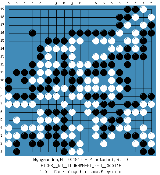 Last move : 1-0 2011 October 30 15:10:58 [Event "FICGS__GO__TOURNAMENT_KYU__000116"] [Site "FICGS"] [Date "2011.02.04"] [Round "1"] [Black "Wyngaarden,Martin"] [White "Piantadosi,Angelo"] [Result "1-0"] [Rating 1 "0454"] 1.d16 q4 2.q16 d4 3.q10 d10 4.k16 k4 5.k10 k8 6.d11 e11 7.d12 e12 8.e13 f13 9.e14 h14 10.h15 g14 11.g15 j15 12.j16 k15 13.l16 m10 14.l11 l10 15.m11 k11 16.j11 k12 17.j9 k9 18.j10 j12 19.h11 g12 20.g11 f11 21.g10 g8 22.f10 e10 23.f9 f8 24.e9 e8 25.d9 c9 26.c10 f12 27.d8 d7 28.c8 b9 29.b8 b10 30.c11 c7 31.b11 j8 32.a9 f14 33.f15 l12 34.m12 m13 35.n12 n13 36.o12 h9 37.p6 r6 38.p5 p4 39.r7 q6 40.q7 s7 41.s8 s6 42.t8 t7 43.o13 o14 44.q14 p14 45.p13 p9 46.o5 n5 47.o4 o3 48.n4 m5 49.o7 m3 50.q9 o8 51.p8 o10 52.p11 o11 53.p10 o9 54.n7 m7 55.n8 n9 56.n11 m9 57.o16 q13 58.r13 q15 59.q12 r14 60.q13 r16 61.s14 r15 62.r17 q17 63.p17 p16 64.q18 r18 65.p18 s17 66.s15 o15 67.n16 m15 68.m16 b7 69.s16 g9 70.n3 n2 71.n6 m4 72.r19 s19 73.q19 a7 74.a10 a8 75.t17 t18 76.t16 n15 77.h12 j13 78.h13 j14 79.m6 l6 80.m8 l7 81.l8 l9 82.s13 q5 83.d3 e3 84.c3 c4 85.b4 b5 86.e2 b3 87.b2 a4 88.f3 e4 89.g3 h3 90.g2 a2 91.b1 a3 92.h2 j3 93.j2 k2 94.d2 j1 95.h1 k1 96.g4 g5 97.h4 j4 98.h5 j6 99.g6 f5 100.h6 h7 101.f6 e6 102.f4 e5 103.r3 s3 104.s2 t2 105.s1 s4 106.t1 t3 107.q3 r2 108.pass 1-0 Here are the names of the openings (joseki) played in the four corners : Corner d4 : d4 j9 Hoshi (Hwajeom, Seongjeom, Xingwei`) 4-4 Point. The star or hoshi (4-4) point, emphasizing influence at the potential expense of territory. Corner q4 : q4 p6 Hoshi (Hwajeom, Seongjeom, Xingwei`) 4-4 Point. The star or hoshi (4-4) point, emphasizing influence at the potential expense of territory. Player Black won this Go (weiqi, baduk) game. Follow this game move after move (download)Win the early ko to win the game. (Anonymous) Panic is a sudden desertion of us, an a going over to the enemy of our imagination. (Christian Nevell Bovee)