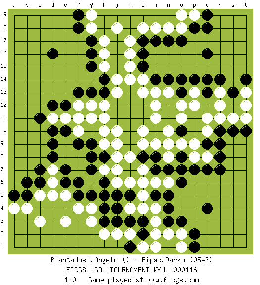 Last move : 1-0 2011 August 6 12:43:14 [Event "FICGS__GO__TOURNAMENT_KYU__000116"] [Site "FICGS"] [Date "2011.02.04"] [Round "1"] [Black "Piantadosi,Angelo"] [White "Pipac,Darko"] [Result "1-0"] [Rating 2 "0543"] 1.k10 k16 2.q16 q10 3.q4 k4 4.d16 j10 5.j11 j9 6.k9 j8 7.d10 d5 8.f6 h11 9.j12 h12 10.h13 g12 11.g13 f12 12.e12 e11 13.f11 f10 14.e10 d11 15.d12 g11 16.c11 f11 17.f13 e9 18.d9 e8 19.d8 d7 20.e7 f7 21.e6 d6 22.g7 f8 23.g8 h10 24.f9 j7 25.h6 j6 26.j5 k6 27.k5 l5 28.j4 l7 29.k3 l4 30.o3 o18 31.o17 n18 32.n17 m18 33.m17 l18 34.l17 k17 35.l16 k15 36.l15 k14 37.k13 l14 38.m14 l13 39.l12 m13 40.n14 m12 41.l11 j14 42.h14 j13 43.k12 m11 44.k11 l9 45.m10 l10 46.l8 m9 47.m8 k8 48.m7 n10 49.o8 f4 50.g5 g4 51.h4 g3 52.o10 o9 53.n7 n9 54.q7 p8 55.p7 q8 56.r8 o11 57.q9 p9 58.r9 n8 59.o7 m6 60.l3 m3 61.n4 m4 62.n5 n6 63.o6 m2 64.l2 l1 65.k1 m1 66.m5 l6 67.j3 h2 68.h3 j2 69.h5 k2 70.c7 e5 71.f5 e3 72.r10 q11 73.o13 p13 74.p14 o12 75.q13 p12 76.q14 n13 77.o14 r12 78.r7 h15 79.g15 h16 80.g16 h17 81.g17 g18 82.f18 g19 83.f19 j18 84.p18 p19 85.q19 o19 86.q18 r13 87.r14 s11 88.s10 t11 89.t10 r11 90.s13 t13 91.t14 t12 92.n3 o2 93.p2 o1 94.p1 n2 95.c6 c5 96.b5 b4 97.b6 a4 98.a5 c3 99.g9 h9 100.h8 h7 101.pass 1-0 Here are the names of the openings (joseki) played in the four corners : Corner q4 : q4 l5 Hoshi (Hwajeom, Seongjeom, Xingwei`) 4-4 Point. The star or hoshi (4-4) point, emphasizing influence at the potential expense of territory. Corner q16 : q16 o18 Hoshi (Hwajeom, Seongjeom, Xingwei`) 4-4 Point. The star or hoshi (4-4) point, emphasizing influence at the potential expense of territory. Player Black won this Go (weiqi, baduk) game. Follow this game move after move (download)If your stone is capped, play the knight's move. (Anonymous) Shallow men believe in luck. Strong men belive in cause and effect. (Ralph Waldo Emerson)