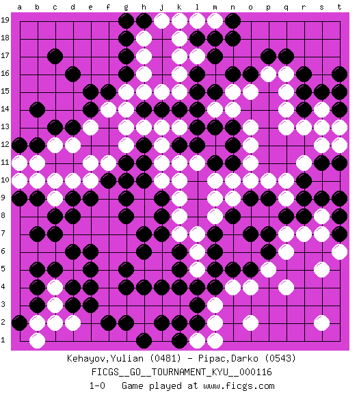 Last move : 1-0 2011 March 8 20:51:24 [Event "FICGS__GO__TOURNAMENT_KYU__000116"] [Site "FICGS"] [Date "2011.02.04"] [Round "1"] [Black "Kehayov,Yulian"] [White "Pipac,Darko"] [Result "1-0"] [Rating 1 "0481"] [Rating 2 "0543"] 1.r16 q16 2.q17 q15 3.r15 q14 4.r14 q13 5.p17 r13 6.o16 o15 7.n16 k16 8.d16 d10 9.d4 k10 10.q8 q10 11.k4 q4 12.o5 p5 13.p6 o4 14.n5 n4 15.m5 q6 16.p7 q7 17.r8 r7 18.p9 p10 19.o9 m9 20.n8 n10 21.g16 m8 22.m7 l7 23.m6 k8 24.d13 q9 25.r9 o10 26.r10 n9 27.o7 r11 28.s11 s12 29.t11 t12 30.s9 s14 31.s15 t15 32.t16 p16 33.t14 s13 34.m15 m14 35.l14 n15 36.l16 k15 37.k14 j15 38.j14 h15 39.h14 g15 40.f15 g14 41.l15 g13 42.c7 f14 43.e15 h16 44.g17 h17 45.g18 h18 46.h19 j19 47.g19 k18 48.e9 e10 49.d9 c10 50.j7 k7 51.k6 l6 52.k5 l5 53.l4 m3 54.l3 m2 55.l2 l1 56.k1 m1 57.j2 o2 58.f10 e11 59.g9 f11 60.g11 g12 61.h11 j11 62.h12 h13 63.j9 k9 64.j8 j10 65.h10 j12 66.b9 c9 67.c8 b10 68.a9 a10 69.b7 e13 70.e14 d12 71.c13 c12 72.b12 b11 73.a12 a11 74.b14 k13 75.m13 n14 76.l13 j13 77.n13 o13 78.n12 o12 79.n11 o11 80.m11 l11 81.l12 m10 82.l18 l17 83.m17 k17 84.n18 l19 85.m18 m19 86.n19 k19 87.g4 s7 88.t8 s8 89.t7 t6 90.t9 s5 91.k12 k11 92.c17 f3 93.e3 f4 94.e4 f5 95.g5 g3 96.f2 h3 97.h4 j3 98.j4 h2 99.m4 k3 100.k2 f6 101.e6 g6 102.h6 f7 103.e5 e8 104.d8 f8 105.g8 f9 106.g10 g7 107.h7 d7 108.d6 e7 109.g2 t13 110.t15 s2 111.h1 c3 112.b4 c4 113.c5 d2 114.b3 b2 115.a2 b1 116.d3 c2 117.b5 pass 118.pass 1-0 Here are the names of the openings (joseki) played in the four corners : Corner q16 : r16 q16 Komoku (Somok, Xiao~mu`) 3-4 Point. The komoku (3-4) point is the traditional corner enclosure move.. Corner q4 : q8 q4 This joseki is unknown. A weak or weird move has probably been played in this corner. Player Black won this Go (weiqi, baduk) game. Follow this game move after move (download)In opponents' sphere of influence, avoid sharp conflict, don't move too deep. (Otake Hideo, 9p) Don't anthropomorphize computers - they hate it. (Anonymous)