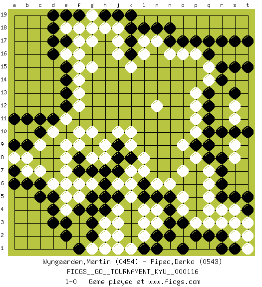 Last move : 1-0 2011 September 4 9:7:54 [Event "FICGS__GO__TOURNAMENT_KYU__000116"] [Site "FICGS"] [Date "2011.02.04"] [Round "1"] [Black "Wyngaarden,Martin"] [White "Pipac,Darko"] [Result "1-0"] [Rating 1 "0454"] [Rating 2 "0543"] 1.q16 q4 2.d16 k10 3.d4 d10 4.k16 g15 5.q10 e4 6.d5 e5 7.d3 e6 8.e3 d6 9.c5 g17 10.e15 f15 11.e17 f17 12.e14 f14 13.e13 f13 14.e12 f12 15.d11 f10 16.r5 p11 17.q11 p10 18.p9 p12 19.q12 p13 20.q13 p8 21.q8 o9 22.q9 o7 23.k4 q7 24.r7 q6 25.r6 q5 26.o3 e11 27.c10 c9 28.c11 e9 29.g4 q14 30.r14 q15 31.r15 p16 32.q17 r4 33.p17 o16 34.o17 n16 35.n17 m17 36.m18 l17 37.k17 l16 38.l18 k15 39.g9 k5 40.l5 k6 41.l6 l7 42.h6 g8 43.h7 h8 44.j7 k7 45.j8 h9 46.j9 j10 47.k8 l8 48.g7 g10 49.f8 f9 50.f7 e7 51.f4 f6 52.g5 g6 53.h5 e8 54.p2 j17 55.k18 j18 56.k19 j16 57.n5 o5 58.n4 o4 59.n3 p3 60.q2 q3 61.r2 s3 62.s5 s4 63.t4 t3 64.t5 n6 65.c6 c7 66.b6 b7 67.a7 a8 68.a6 b10 69.b11 a10 70.a11 m6 71.m5 e18 72.d18 f16 73.e19 f18 74.f19 g19 75.d19 e16 76.d17 j4 77.j5 j3 78.k3 j2 79.k2 k1 80.l1 j1 81.b9 b8 82.a9 l2 83.m1 l4 84.m2 l3 85.g2 h3 86.g3 m3 87.n2 s2 88.s1 t2 89.o1 t1 90.r1 g1 91.f1 h1 92.h19 g18 93.j19 h18 94.e2 k9 95.n18 s8 96.r8 s9 97.s10 r16 98.r17 s16 99.s17 t16 100.s15 f5 101.t15 r3 102.t17 j6 103.pass s11 104.r10 s12 105.s13 m4 106.t10 h2 107.h4 m12 108.pass pass 109.pass 1-0 Here are the names of the openings (joseki) played in the four corners : Corner d16 : d16 g15 Hoshi (Hwajeom, Seongjeom, Xingwei`) 4-4 Point. The star or hoshi (4-4) point, emphasizing influence at the potential expense of territory. Corner d4 : d4 e4 Hoshi (Hwajeom, Seongjeom, Xingwei`) 4-4 Point. The star or hoshi (4-4) point, emphasizing influence at the potential expense of territory. Corner q4 : q4 r5 Hoshi (Hwajeom, Seongjeom, Xingwei`) 4-4 Point. The star or hoshi (4-4) point, emphasizing influence at the potential expense of territory. Corner q16 : q16 p11 Hoshi (Hwajeom, Seongjeom, Xingwei`) 4-4 Point. The star or hoshi (4-4) point, emphasizing influence at the potential expense of territory. Player Black won this Go (weiqi, baduk) game. Follow this game move after move (download)Knight's moves win running battles. (Anonymous) You think that education is too expensive ? Try ignorance. (Derek Bok)
