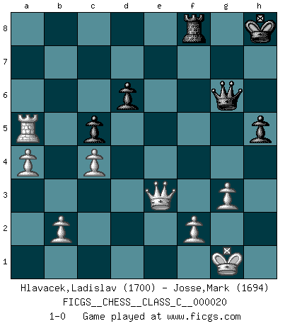 Last move : 1-0 2007 January 7 21:55:46 [Event "FICGS__CHESS__CLASS_C__000020"] [Site "FICGS"] [Date "2006.12.06"] [Round "1"] [White "Hlavacek,Ladislav"] [Black "Josse,Mark"] [Result "1-0"] [WhiteElo "1700"] [BlackElo "1694"] 1.c4 e5 2.Nc3 Nc6 3.g3 g6 4.Bg2 Bg7 5.e3 d6 6.Nf3 f5 7.d3 Nge7 8.O-O O-O 9.Qb3 h6 10.Bd2 Kh8 11.a4 a5 12.Nd5 g5 13.Bc3 f4 14.exf4 gxf4 15.Nh4 Bf6 16.Nxf6 Rxf6 17.Rae1 Qf8 18.d4 Nxd4 19.Bxd4 exd4 20.Re4 Bd7 21.Rxd4 Bc6 22.Bxc6 bxc6 23.Re1 fxg3 24.hxg3 Qg7 25.Rde4 Ng6 26.Rg4 Qf7 27.Rxg6 Rxg6 28.Re7 Qf6 29.Nxg6+ Qxg6 30.Rxc7 Rf8 31.Qe3 c5 32.Ra7 h5 33.Rxa5 1-0 English : Closed system Kingside Castling by player White (move 8) Kingside Castling by player Black (move 8) Player White won this chess game. Follow this game move after move (download)Modern Chess is too much concerned with things like Pawn structure. Forget it, Checkmate ends the game. (Nigel Short) Ein Kibitz ist einer, der deinem Gegner gute Ratschläge gibt. (Andrew Soltis) Aquellos que dicen que entienden al Ajedrez, no entienden nada. (Robert Hubner) Le génie consiste à savoir transgresser les règles au moment opportun. (Teichmann) I've lost money so fast in these clubs it's left me reeling. I've read every poker book ever written, but the only way to get better at the game is to go out and play with people who are really good. The problem is, you stand to lose a lot of money doing it. (Matt Damon)
