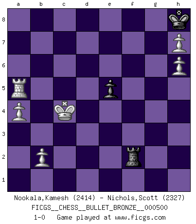 Last move : 1-0 2011 February 6 17:44:10 [Event "FICGS__CHESS__BULLET_BRONZE__000500"] [Site "FICGS"] [Date "2011.02.06"] [Round "1"] [White "Nookala,Kamesh"] [Black "Nichols,Scott"] [Result "1-0"] [WhiteElo "2414"] [BlackElo "2327"] 1.e4 d6 2.Nf3 Nf6 3.Nc3 c5 4.d4 cxd4 5.Nxd4 a6 6.f3 e5 7.Nb3 Be7 8.Be3 Be6 9.a3 Nbd7 10.Qd2 Qc7 11.g4 b5 12.g5 Nh5 13.O-O-O Nb6 14.Kb1 O-O 15.Na5 Rab8 16.Nd5 Nxd5 17.exd5 Bxd5 18.Qxd5 Qxa5 19.Bc4 Qc7 20.Ba2 g6 21.Rhf1 Qb7 22.Qd3 b4 23.a4 Qc6 24.Bb3 Rbe8 25.Bd2 a5 26.f4 Ng7 27.Bd5 Qc7 28.h4 Bd8 29.f5 Nxf5 30.Rxf5 gxf5 31.Qxf5 Kh8 32.Be4 f6 33.g6 Rg8 34.h5 Qg7 35.gxh7 Rgf8 36.Be3 d5 37.h6 Qf7 38.Rxd5 Qe6 39.Qg6 Qf7 40.Qg2 f5 41.Bxf5 b3 42.Rd1 Bf6 43.Bg6 Qc4 44.Bxe8 bxc2+ 45.Qxc2 Qxc2+ 46.Kxc2 Rxe8 47.Rd6 Rc8+ 48.Kb3 Rb8+ 49.Kc4 Bh4 50.Rb6 Rf8 51.Rb5 Bf2 52.Bxf2 Rxf2 53.Rxa5 1-0 King's pawn Opening Queenside Castling by player White (move 13) Kingside Castling by player Black (move 14) 10 pieces endgame at move 52 : White KRPPPP , Black KRPP WHITE : King + 1 Rook 4 Pawns BLACK : King + 1 Rook 2 Pawns 9 pieces endgame at move 53 : White KRPPPP , Black KRP WHITE : King + 1 Rook 4 Pawns BLACK : King + 1 Rook 1 Pawn Player White won this chess game. Follow this game move after move (download)Nowadays, when you're not a grandmaster at 14, you can forget about it. (Anand Viswanathan) Es war undenkbar für die Behörden, dass ein sowjetischer Großmeister auf diese Art und Weise [Fischer-Taimanov 6:0] verliert, ohne dass es eine politischer Erklärung dafür gäbe. (Mark Taimanov) La batalla por la última verdad nunca sera ganada. Y es por eso que el Ajedrez es tan fascinante. (Hans Kmoch) Lorsque vous vous retrouvez devant une position atroce, ne tendez pas un ultime piège dérisoire avec l'intention d'abandonner si l'adversaire le déjoue ! Faites-vous plutôt un devoir de résister comme si votre vie en dépendait. Jouez le coup qui vous déplairait au centuple si vous étiez dans la peau de votre tortionnaire ! Luck is when opportunity knocks and you answer. (Anonymous)