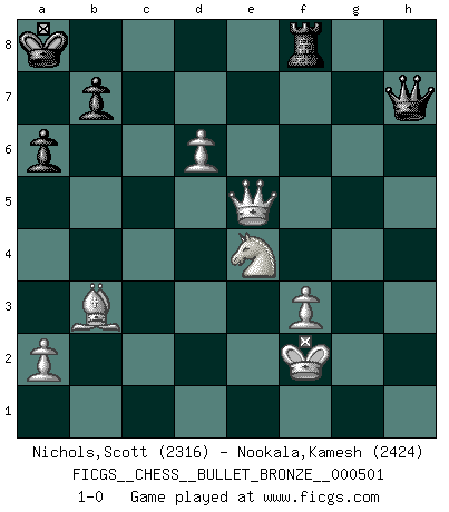 Last move : 1-0 2011 February 6 18:47:33 [Event "FICGS__CHESS__BULLET_BRONZE__000501"] [Site "FICGS"] [Date "2011.02.06"] [Round "1"] [White "Nichols,Scott"] [Black "Nookala,Kamesh"] [Result "1-0"] [WhiteElo "2316"] [BlackElo "2424"] 1.Nf3 Nf6 2.g3 d5 3.Bg2 c6 4.O-O Bg4 5.d3 Nbd7 6.h3 Bxf3 7.exf3 e6 8.f4 h5 9.Re1 h4 10.g4 g6 11.Nd2 Qc7 12.Nf3 Bd6 13.Qd2 O-O-O 14.b4 e5 15.Ng5 Rhf8 16.fxe5 Nxe5 17.Rb1 Rde8 18.b5 cxb5 19.Rxb5 Nc6 20.Nf3 Nd7 21.Nxh4 Nb6 22.Nf3 Kb8 23.Rb1 Na4 24.c3 Qa5 25.Rb3 Qc7 26.Rb5 Nb6 27.Rxe8+ Rxe8 28.Rb1 f5 29.Qg5 Qf7 30.Bd2 fxg4 31.Qxg4 Qf6 32.Be3 Qxc3 33.Qxg6 Rd8 34.Bg5 Be7 35.h4 Ka8 36.Rc1 Qb4 37.Qe6 Bxg5 38.hxg5 Qb2 39.Re1 a6 40.g6 Rf8 41.Qg4 Nc8 42.Qd7 Rg8 43.Qf7 N8e7 44.Rxe7 Nxe7 45.Qxe7 Qc1+ 46.Ne1 Qh6 47.Bxd5 Rxg6+ 48.Kf1 Rb6 49.Qe8+ Ka7 50.Bb3 Rf6 51.Ke2 Qh7 52.Qe5 Rf5 53.Qe3+ Ka8 54.Qe8+ Ka7 55.Nf3 Qh1 56.Nd2 Rc5 57.Qe3 Qh5+ 58.f3 Ka8 59.d4 Rf5 60.d5 Qh2+ 61.Kd3 Qh7 62.Ne4 Qh5 63.Ke2 Qh2+ 64.Qf2 Qe5 65.Ke3 Qc7 66.Kd3 Qf4 67.d6 Qe5 68.Qg3 Qb5+ 69.Ke3 Rf8 70.Qg7 Qb6+ 71.Ke2 Qb5+ 72.Kf2 Qf5 73.Bd1 Rf7 74.Qg5 Qh7 75.Bb3 Rf8 76.Qe5 1-0 Reti Opening Kingside Castling by player White (move 4) Queenside Castling by player Black (move 13) Player White won this chess game. Follow this game move after move (download)The Pawns are the soul of the game. (Francois Andre Danican Philidor) Ich rechne überhaupt nicht voraus. Ich gewinne auch so. (Robert James Fischer) Muchos jugadores de Ajedrez se sorprendían cuando después de la partida, Fischer explicaba con calma: 'Yo ya había analizado esta posibilidad' en una posición en la cual yo creía que no era posible de prever desde la apertura. (Mikhail Tal) Un footballeur joue avec ses pieds, parfois avec sa tête. Un joueur d'échecs ne joue qu'avec sa tête. Et quand il ne joue plus, il meurt. (Jacob Murray) The best weapon against an enemy is another enemy. (Friedrich Nietzsche)