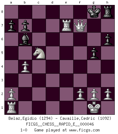 Last move : 1-0 2011 March 10 20:5:56 [Event "FICGS__CHESS__RAPID_E__000046"] [Site "FICGS"] [Date "2011.02.07"] [Round "1"] [White "Belaz,Egidio"] [Black "Cavaille,Cedric"] [Result "1-0"] [WhiteElo "1294"] [BlackElo "1092"] 1.e4 c5 2.Bc4 d6 3.Nf3 Nf6 4.Nc3 Nc6 5.Ng5 e6 6.O-O d5 7.exd5 exd5 8.Be2 Nd4 9.Re1 Nxe2+ 10.Nxe2 h6 11.Nf3 c4 12.c3 g5 13.d3 cxd3 14.Qxd3 Qd7 15.Nfd4 Bc5 16.b4 Bb6 17.c4 dxc4 18.Qxc4 Qd5 19.Nc3 Be6 20.Nxd5 Nxd5 21.Qxd5 Rd8 22.Qb5+ Kf8 23.Nxe6+ Ke7 24.Nc5 Kf6 25.Bb2+ Kg6 26.Bxh8 Rxh8 27.Qd3+ f5 28.Re6+ Kf7 29.Qxf5+ Kg7 30.Re7+ Kg8 31.Qf7+ 1-0 Sicilian defense Kingside Castling by player White (move 6) Player White won this chess game. Follow this game move after move (download)Fischer is the strongest player in the world. In fact, the strongest player who ever lived. (Larry Evans) Wie bekannt hörte Morphy 1859 auf, Schach zu spielen. Seine Enttäuschung galt nicht so sehr dem Schach, wie den Schachspielern. (Robert James Fischer) Siempre es mucho mejor sacrificar las piezas de tu oponente. (Savielly Tartakover) Les échecs sont plus proches de l'art de l'assassinat que de l'art de la guerre. (Arturo Perez-Reverte) A mistake is only a mistake if you let it happen twice. Otherwise it is a learning experience. (Daniel Parmet)