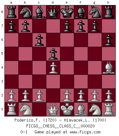 Last move : 0-1 2007 February 8 15:23:30 [Event "FICGS__CHESS__CLASS_C__000020"] [Site "FICGS"] [Date "2006.12.06"] [Round "1"] [White "Poderico,Francesco"] [Black "Hlavacek,Ladislav"] [Result "0-1"] [WhiteElo "1720"] [BlackElo "1700"] 1.d4 d5 2.Bg5 h6 3.Bh4 c6 0-1 This chess game has been lost on time (started : 2006.12.06 16:13:10) Comment by player 2 : Ladislav Hlavacek : Press move !!!!!!!!!!!!!!!!!! Levitsky attack (Queen's Bishop attack) Player Black won this chess game. Follow this game move after move (download)Up to this point White has been following well-known analysis. But now he makes a fatal error: he begins to use his own head. (Siegbert Tarrasch) Jeder Fehler erscheint unglaublich dumm, wenn andre ihn begehen. (Georg Christoph Lichtenberg) El sobresalir en el Ajedrez es un signo de una mente intrigante. (Sir Arthur Conan Doyle) On n'a jamais que l'âge auquel on a commence à jouer aux échecs car après on cesse de vieillir. (Capablanca) The worth of a book is to be measured by what you can carry away from it. (James Bryce)