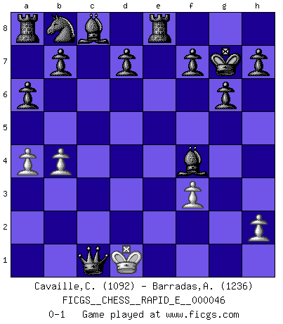 Last move : 0-1 2011 February 22 20:14:47 [Event "FICGS__CHESS__RAPID_E__000046"] [Site "FICGS"] [Date "2011.02.07"] [Round "1"] [White "Cavaille,Cedric"] [Black "Barradas,Anderson"] [Result "0-1"] [WhiteElo "1092"] [BlackElo "1236"] 1.e4 c5 2.Nf3 e6 3.d4 cxd4 4.Nxd4 Bc5 5.Nc3 a6 6.a4 Qf6 7.Be3 e5 8.Nd5 Qd6 9.Nf5 Qc6 10.Qh5 g6 11.Ng7+ Kf8 12.Qxe5 Bd6 13.Qf6 Nxf6 14.Bb5 Qxc2 15.Rb1 Qxb1+ 16.Ke2 Qxh1 17.Bf4 Bxf4 18.Nxf6 Kxg7 19.Nd5 Bd6 20.Bc4 Qxg2 21.b4 Qxe4+ 22.Ne3 Re8 23.f3 Qxe3+ 24.Kd1 Qd4+ 25.Kc2 Qxc4+ 26.Kd2 Bf4+ 27.Kd1 Qc1+ 0-1 Sicilian defense Player Black won this chess game. Follow this game move after move (download)I have never in my life played the French Defence, which is the dullest of all openings. (Wilhelm Steinitz) Spiel ein langweiliges Spiel zu Ende und lustige Dinge können passieren. (Hans Ree) Los Peones son nacidos libres, y aún así, se encuentran encadenados por todos lados. (Rick Kennedy) Nous sommes les pions de la mystérieuse partie d'Echecs jouée par Dieu. Il nous déplace, nous arrête, nous pousse encore, puis nous lance un à un dans la boîte du Néant. Epitaphe sur la tombe de David Janowsky (1868-1927). Hello Thibault, if I have had a plan (and I had one, I hope), I have forgotten it during the last week... - Hello Heinz-Georg. What do you mean a plan ? (Anonymous players, during a Big Chess game)