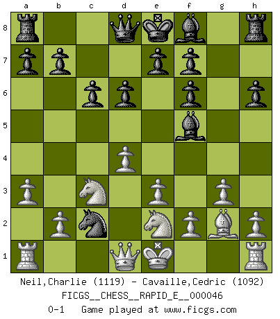 Last move : 0-1 2011 February 16 19:27:3 [Event "FICGS__CHESS__RAPID_E__000046"] [Site "FICGS"] [Date "2011.02.07"] [Round "1"] [White "Neil,Charlie"] [Black "Cavaille,Cedric"] [Result "0-1"] [WhiteElo "1119"] [BlackElo "1092"] 1.d4 Nf6 2.Bg5 h6 3.Bxf6 gxf6 4.e3 c6 5.g3 d6 6.Bg2 Na6 7.Ne2 Bf5 8.Nbc3 Nb4 9.a3 Nxc2+ 0-1 Trompowsky attack (Ruth, Opovcensky Opening) Player Black won this chess game. Follow this game move after move (download)In Chess, as it is played by masters, chance is practically eliminated. (Emanuel Lasker) Aljechin war kein Nazi. Er war ein Opportunist. Ein schrecklicher Mann. Er liebte Geld über alles und würde für Geld ein Jude, ein Katolik oder ein Protestant werden. (Miguel Najdorf) Nada excita más a Grandes Maestros aburridos que una novedad teórica. (Dominic Lawson) Comme les marins qui ont mille raisons différentes d'aller en mer, les joueurs d'échecs en ont tout autant avant de s'installer devant une table et jouer... (Vincent Bertignac, philosophe) The problem with manipulation is that people can turn on you. (Horatio Caine, C.S.I. Miami)