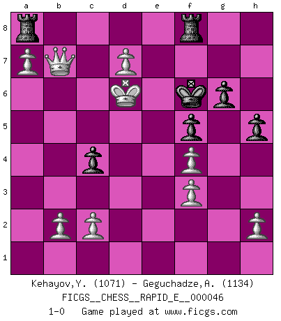 Last move : 1-0 2011 May 18 10:40:58 [Event "FICGS__CHESS__RAPID_E__000046"] [Site "FICGS"] [Date "2011.02.07"] [Round "1"] [White "Kehayov,Yulian"] [Black "Geguchadze,Alexander"] [Result "1-0"] [WhiteElo "1071"] [BlackElo "1134"] 1.e4 c5 2.Nf3 d6 3.Nc3 Nf6 4.d4 cxd4 5.Qxd4 Nc6 6.Qa4 Bd7 7.Bg5 a6 8.Qb3 b5 9.Bd3 Be6 10.Qa3 Bg4 11.Nd5 Nxd5 12.exd5 Bxf3 13.gxf3 Ne5 14.Be2 Qc8 15.O-O-O g6 16.Rhe1 h6 17.Bh4 Nd7 18.f4 Qc5 19.Qb3 Kd8 20.Rd2 Rc8 21.Bf1 Nb6 22.Re4 Rc7 23.f3 Nc4 24.Bxc4 bxc4 25.Qb8+ Rc8 26.Qb7 Qc7 27.Qxa6 f5 28.Re6 Ke8 29.Rde2 Kf7 30.Bxe7 Bxe7 31.Rxe7+ Qxe7 32.Rxe7+ Kxe7 33.Qa7+ Kf6 34.Qd7 Rhe8 35.Qxd6+ Kf7 36.Qd7+ Kg8 37.Kd2 h5 38.Kc3 Rcd8 39.Qc6 Kg7 40.Qc7+ Kf6 41.a4 Rc8 42.Qb6+ Kf7 43.Qb7+ Kf6 44.a5 Rb8 45.Qc6+ Kf7 46.a6 Rbc8 47.Qb7+ Kf6 48.a7 Re3+ 49.Kd4 R3e8 50.d6 Rcd8 51.d7 Rf8 52.Kd5 Ra8 53.Kd6 1-0 Sicilian Queenside Castling by player White (move 15) Player White won this chess game. Follow this game move after move (download)It is not a move, even the best move that you must seek, but a realizable plan. (Eugene Znosko-Borovsky) Ich habe Kasparov in Rente geschickt. (Veselin Topalov) El Jaque al descubierto es el bombardero del tablero. (Reuben Fine) Une platitude souvent récitée à propos des Echecs est qu'une des choses les plus difficiles à réaliser est de gagner une position gagnante. Cela ne manque pas de sens mais, pour ma part, j'ai toujours trouvé plus difficile de gagner une position perdante. (Tim Krabbe) We cannot be sure of having something to live for unless we are willing to die for it. (Ernesto Che Guevara)