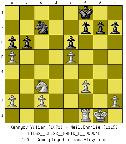 Last move : 1-0 2011 February 19 17:14:5 [Event "FICGS__CHESS__RAPID_E__000046"] [Site "FICGS"] [Date "2011.02.07"] [Round "1"] [White "Kehayov,Yulian"] [Black "Neil,Charlie"] [Result "1-0"] [WhiteElo "1071"] [BlackElo "1119"] 1.e4 c5 2.Nc3 Nc6 3.Nf3 d6 4.d4 cxd4 5.Nxd4 Nf6 6.Bc4 e6 7.O-O Be7 8.Be2 a6 9.Be3 Nxd4 10.Qxd4 Bd7 11.f4 O-O 12.e5 dxe5 13.fxe5 Ne8 14.Rad1 Bc6 15.Qxd8 Rxd8 16.Rxd8 Bxd8 17.Bc5 Ba5 18.Bf3 Bxf3 19.gxf3 Nc7 20.b4 b6 21.Bxf8 Kxf8 22.bxa5 1-0 Sicilian : Closed, 2...Nc6 Kingside Castling by player White (move 7) Kingside Castling by player Black (move 11) Player White won this chess game. Follow this game move after move (download)Chess is so inspiring that I do not believe a good player is capable of having an evil thought during the game. (Wilhelm Steinitz) Matt entspricht nicht immer den Tatsachen. (Savielly Grigorievitsch Tartakower) La maestría del Ajedrez consiste esencialmente en analizar posiciónes de Ajedrez con precisión. (Mikhail Botvinnik) Botvinnik disait en comparant les échecs à la musique: Il existe une science dont le but est l'étude de l'acoustique et des sons. Mais il y a aussi un art qui se sert de l'océan des sons : c'est la musique. De toute évidence, il en est de même pour la pensée. La logique est l'étude des lois de la réflexion et les échecs reflètent, en tant qu'art, le côté logique de la réflexion, sous la forme d'images artistiques... Extrait de Fischer - Spassky, Reykjavik 1972 par Alexander & F. Wyndham (Ed. Solar), p 37. A good aphorism is too hard for the tooth of time, and is not worn away with the centuries, although it serves as food for every speech. (Friedrich Nietzsche)