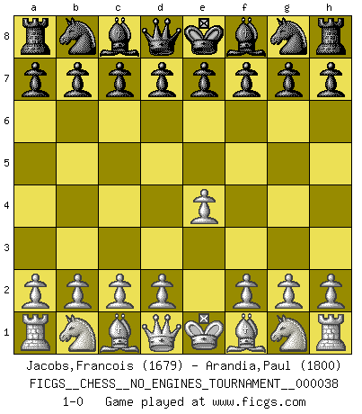 Last move : 1-0 2011 March 20 0:34:18 [Event "FICGS__CHESS__NO_ENGINES_TOURNAMENT__000038"] [Site "FICGS"] [Date "2011.02.07"] [Round "1"] [White "Jacobs,Francois"] [Black "Arandia,Paul"] [Result "1-0"] [WhiteElo "1679"] [BlackElo "1800"] 1.e4 1-0 This chess game has been lost on time (started : 2011.02.07 13:26:58) King's pawn Opening Player White won this chess game. Follow this game move after move (download)Dazzling combinations are for the many, shifting wood is for the few. (Georg Kieninger) Ich tröste mich mit dem Vergnügen, daß Schachfans, Zuschauer und Leser glücklich sind, wenn ein Großmeister etwas riskiert, statt nur Klötzchen zu schieben. (Mikhail Nekhemyevich Tal) Un jugador que trata de regresar una movida en el Ajedrez es un futuro carterista. (Richard Fenton) Le plus grand jeu de l'esprit jamais inventé, plus vous l'apprenez, plus vous y prenez du plaisir. (Garry Kasparov) A good player is always lucky. (Capablanca)