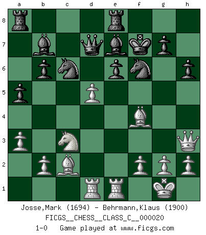 Last move : 1-0 2006 December 25 0:5:54 [Event "FICGS__CHESS__CLASS_C__000020"] [Site "FICGS"] [Date "2006.12.06"] [Round "1"] [White "Josse,Mark"] [Black "Behrmann,Klaus"] [Result "1-0"] [WhiteElo "1694"] [BlackElo "1900"] 1.e4 c6 2.d4 d5 3.exd5 cxd5 4.c4 Nf6 5.Nc3 e6 6.Nf3 Be7 7.cxd5 Nxd5 8.Bd3 O-O 9.O-O Nc6 10.Re1 Nf6 11.a3 b6 12.Bc2 Bb7 13.Qd3 a5 14.Bf4 Re8 15.Rad1 Ba6 16.Qe3 Bb7 17.Ng5 Qd7 18.Qh3 h6 19.Nxf7 Kxf7 20.d5 1-0 Caro-Kann : Panov-Botvinnik attack, 5...e6 Kingside Castling by player Black (move 8) Kingside Castling by player White (move 9) Player White won this chess game. Follow this game move after move (download)Chess, like love, is infectious at any age. (Flohr) Bis zum Jahr 1971 verlief in meiner Schachkariere alles glatt. Dieses dramatische Match [Fischer-Taimanov 6:0] machte mein Leben zur Hölle. (Mark Taimanov) Fischer era un maestro de claridad y un Rey del posicionamiento astuto. Sus oponentes podían ver hacia donde se dirigía pero eran impotentes para detenerlo. (Bruce Pandolfini) La vérité est comme le meilleur coup aux échecs : elle existe, mais il faut la chercher. (Arturo Perez-Reverte) Philosophers use a language that is already deformed as though by shoes that are too tight. (Ludwig Wittgenstein)