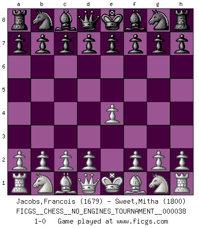 Last move : 1-0 2011 March 20 0:34:18 [Event "FICGS__CHESS__NO_ENGINES_TOURNAMENT__000038"] [Site "FICGS"] [Date "2011.02.07"] [Round "1"] [White "Jacobs,Francois"] [Black "Sweet,Mitha"] [Result "1-0"] [WhiteElo "1679"] [BlackElo "1800"] 1.e4 1-0 This chess game has been lost on time (started : 2011.02.07 13:26:58) King's pawn Opening Player White won this chess game. Follow this game move after move (download)Examine moves that smite! A good eye for smites is far more important than a knowledge of strategical principles. (Purdy) Karpov ist ein Museumsstück. (Garry Kasparov) Cada Peón es potencialmente una Reina. (James Mason) La tactique, c'est ce que vous faites quand il y a quelque chose à faire; la stratégie, c'est ce que vous faites quand il n'y a rien à faire. (Savielli Tartacower) Thibault, I ask for draw. Game 13876. - Sorry Ilmars, you won. (FICGS chat)