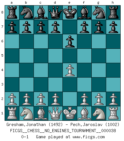 Last move : 0-1 2011 March 29 1:51:26 [Event "FICGS__CHESS__NO_ENGINES_TOURNAMENT__000038"] [Site "FICGS"] [Date "2011.02.07"] [Round "1"] [White "Gresham,Jonathan"] [Black "Pech,Jaroslav"] [Result "0-1"] [WhiteElo "1492"] [BlackElo "1002"] 1.e4 e6 0-1 This chess game has been lost on time (started : 2011.02.07 13:26:58) French defense Player Black won this chess game. Follow this game move after move (download)By this measure (on the gap between Fischer & his contemporaries), I consider him the greatest world champion. (Garry Kasparov) Der Verteidiger gebe der Gewalt nach, aber nur der Gewalt. Er schaffe sich nicht freiwillig, etwa aus Blindheit oder aus Schrecken, irgendwelche Schwächen. Er lasse sich nicht bluffen. (Emanuel Lasker) El ganar no lo es todo... pero el perder es nada. (Mednis) Il n'y a pas de prix trop élevé au scalp de l'ennemi. (Koblentz) He is a liar. I just don't know what the lie is yet. (Horatio Caine, C.S.I. Miami)