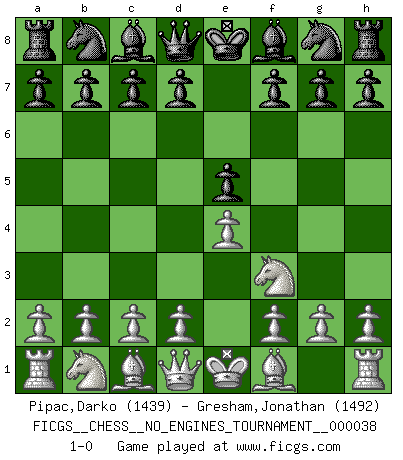 Last move : 1-0 2011 March 20 12:34:2 [Event "FICGS__CHESS__NO_ENGINES_TOURNAMENT__000038"] [Site "FICGS"] [Date "2011.02.07"] [Round "1"] [White "Pipac,Darko"] [Black "Gresham,Jonathan"] [Result "1-0"] [WhiteElo "1439"] [BlackElo "1492"] 1.e4 e5 2.Nf3 1-0 This chess game has been lost on time (started : 2011.02.07 13:26:58) King's knight Opening Player White won this chess game. Follow this game move after move (download)It is difficult to play against Einstein's theory --on his first loss to Fischer. (Mikhail Tal) Ich verachte Kasparow. (Viktor Kortschnoi) El Ajedrez detiene a su maestro dentro de sus propios vínculos, encadenando la mente y el cerebro, por lo que la libertad interior del mas fuerte debe sufrir. (Albert Einstein) Les Echecs, c'est l'art de la guerre sans les charniers, c'est la résurrection des morts tombés au champ d'honneur, l'espoir perpétuel, la suprématie de l'intelligence sur la force, la culture de l'esprit. (F. Szpiner) There is no vagueness without wind. (Chinese proverb)