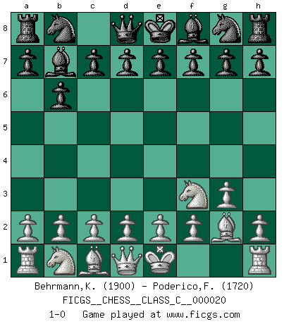 Last move : 1-0 2007 February 9 3:27:32 [Event "FICGS__CHESS__CLASS_C__000020"] [Site "FICGS"] [Date "2006.12.06"] [Round "1"] [White "Behrmann,Klaus"] [Black "Poderico,Francesco"] [Result "1-0"] [WhiteElo "1900"] [BlackElo "1720"] 1.Nf3 b6 2.g3 Bb7 3.Bg2 1-0 This chess game has been lost on time (started : 2006.12.06 16:13:10) Reti Opening Player White won this chess game. Follow this game move after move (download)Chess is everything: art, science and sport. (Anatoly Karpov) Korrekt heißt in Deutschland die Haltung eines Mannes, dessen Benehmen nach dem Urteile seiner Nachbarn seiner Stellung angemessen ist. Um korrekt zu sein, muß man sich der Meinung der anderen anpassen... (Emanuel Lasker) Fischer deseaba darle a los Rusos una sopa de su propia medicina. (Larry Evans) La menace est plus forte que l'exécution. (Aaron Nimzovitch) Without deviation from the norm, progress is not possible. (Frank Zappa)