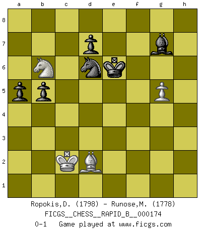 Last move : 0-1 2011 April 22 7:16:10 [Event "FICGS__CHESS__RAPID_B__000174"] [Site "FICGS"] [Date "2011.02.07"] [Round "1"] [White "Ropokis,Dimitrios"] [Black "Runose,Michael"] [Result "0-1"] [WhiteElo "1798"] [BlackElo "1778"] 1.e4 e5 2.Nf3 Nc6 3.Nc3 Nf6 4.d4 exd4 5.Nd5 Nxe4 6.Qe2 f5 7.Ng5 d3 8.cxd3 Nd4 9.Qh5+ g6 10.Qh4 c6 11.dxe4 cxd5 12.exd5 Bg7 13.Kd1 h6 14.Nf3 b6 15.Qxd8+ Kxd8 16.Nh4 g5 17.Ng6 Rg8 18.h4 f4 19.d6 Bb7 20.Ne7 Re8 21.hxg5 hxg5 22.Rh5 Ne6 23.f3 Rh8 24.Rxh8+ Bxh8 25.Bd3 Be5 26.Nf5 g4 27.fxg4 Bxg2 28.Ke2 Rc8 29.Kf2 Bb7 30.Kf1 Ke8 31.Bd2 Bxb2 32.Re1 Kf7 33.Ne7 Rh8 34.Be4 Bxe4 35.Rxe4 Rh1+ 36.Kg2 Ra1 37.Bxf4 Rxa2 38.Kf3 b5 39.Be3 Ra4 40.g5 Nd8 41.Bd2 Rxe4 42.Kxe4 Nb7 43.Nc8 a5 44.Kd3 Bg7 45.Nb6 Ke6 46.Kc2 Nxd6 0-1 Four knights : Belgrade gambit 10 pieces endgame at move 46 : White KBNP , Black KBNPPP WHITE : King + 1 Bishop 1 Knight 1 Pawn BLACK : King + 1 Bishop 1 Knight 3 Pawns Player Black won this chess game. Follow this game move after move (download)I thought the most common mistake [in chess] was the first one: Learning the game :P (Garvin Gray, FICGS forum) Als er Schachweltmeister wurde ließ er praktisch alle stärksten Sovietspieler für sich arbeiten. Wenn ein auch nur mittelmässiger Meister ein Spezialist für eine bestimmte Eröffnung war, wurde er von Karpov gerufen. Das wurde alles geheim gehalten. (Mikhail Moiseyevich Botvinik) Me siento como si fuera una pieza en una partida de Ajedrez, cuando mi oponente me indica: esa pieza no puede ser movida. (Soren Kierkegaard) Nous sommes les pions de la mystérieuse partie d'Echecs jouée par Dieu. Il nous déplace, nous arrête, nous pousse encore, puis nous lance un à un dans la boîte du Néant. Epitaphe sur la tombe de David Janowsky (1868-1927). I don't diet. I just don't eat as much as I'd like to. (Linda Evangelista, supermodel)