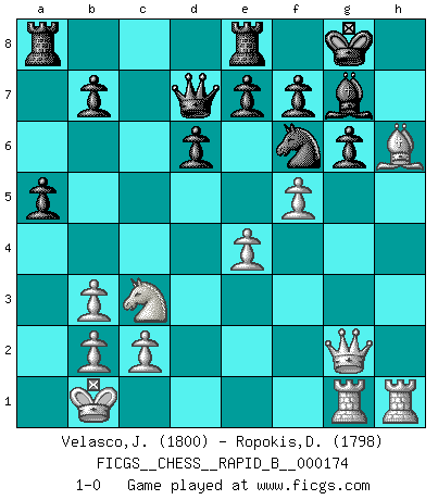 Last move : 1-0 2011 February 16 19:11:12 [Event "FICGS__CHESS__RAPID_B__000174"] [Site "FICGS"] [Date "2011.02.07"] [Round "1"] [White "Velasco,Jose Maria"] [Black "Ropokis,Dimitrios"] [Result "1-0"] [WhiteElo "1800"] [BlackElo "1798"] 1.e4 c5 2.Ne2 Nc6 3.Nbc3 g6 4.d4 cxd4 5.Nxd4 Bg7 6.Be3 Nf6 7.Bc4 O-O 8.Bb3 d6 9.f3 Bd7 10.Qd2 Na5 11.h4 h5 12.O-O-O Nxb3+ 13.axb3 Re8 14.Kb1 a5 15.g4 hxg4 16.h5 Nxh5 17.fxg4 Nf6 18.Bh6 Bh8 19.Nf5 Bxf5 20.gxf5 Qd7 21.Qg2 Bg7 22.Rdg1 1-0 Sicilian : Keres variation (2.Ne2) Kingside Castling by player Black (move 7) Queenside Castling by player White (move 12) Player White won this chess game. Follow this game move after move (download)Chess is a terrible game. If you have no center, your opponent has a freer position. If you do have a center, then you really have something to worry about ! (Siegbert Tarrasch) Der vorletzte Fehler gewinnt. (Savielly Grigorievitsch Tartakower) Yo tuve un dolor de muelas en la primer partida. En el segundo juego, tuve un dolor de cabeza. En el tercero, tuve un ataque de reumatísmo. En la cuarta partida, no me sentía muy bien. ¿Y en el quinto juego? Bueno, ¿que acaso uno tiene que ganar todos los juegos?. (Siegbert Tarrasch) Il vaut mieux sacrifier les pièces de l'adversaire. (Xavier Tartacover) I would love to change the world, but they won't give me the source code. (Unknown)