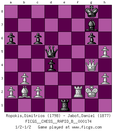 Last move : 1/2-1/2 2011 April 24 20:38:27 [Event "FICGS__CHESS__RAPID_B__000174"] [Site "FICGS"] [Date "2011.02.07"] [Round "1"] [White "Ropokis,Dimitrios"] [Black "Jabot,Daniel"] [Result "1/2-1/2"] [WhiteElo "1798"] [BlackElo "1877"] 1.e4 c5 2.Nc3 Nc6 3.f4 g6 4.Nf3 Bg7 5.Bb5 Nd4 6.O-O a6 7.Bd3 e6 8.Nxd4 cxd4 9.Ne2 Ne7 10.Qe1 Nc6 11.b3 O-O 12.Bb2 e5 13.Qf2 d5 14.Rae1 Be6 15.Ba3 dxe4 16.Bxe4 Re8 17.fxe5 Nxe5 18.Nf4 Rc8 19.Nxe6 Rxe6 20.g4 Qa5 21.Bb2 Rc7 22.h3 Rce7 23.Kh1 Nc6 24.Bxc6 bxc6 25.Rxe6 fxe6 26.Qf3 Qd5 27.Kg2 e5 28.d3 e4 29.dxe4 Rxe4 30.Rf2 h5 31.gxh5 Qg5+ 32.Kf1 Qb5+ 33.Kg1 Re1+ 34.Kg2 Qg5+ 35.Qg4 Qd5+ 1/2-1/2 Sicilian : Grand Prix attack Kingside Castling by player White (move 6) Kingside Castling by player Black (move 11) This chess game ended in a draw. Follow this game move after move (download)I had a toothache during the first game. In the second game I had a headache. In the third game it was an attack of rheumatism. In the fourth game, I wasn't feeling well. And in the fifth game? Well, must one have to win every game ? (Siegbert Tarrasch) Ein Schachgenie ist jemand der verdammt gut Schach spielt. (Jonathan Levitt) Todo lo que importa ante el tablero de Ajedrez son buenas jugadas. (Bobby Fischer) C'est une question de caractère, Beaucoup de gens perdent leur motivation très vite. D'autres, ils sont rares, peuvent la conserver très longtemps. J'aime les échecs, encore aujourd'hui je suis heureux d'analyser des parties. J'aime toujours gagner, je déteste encore perdre. Bien jouer est important pour mon intégrité intellectuelle et morale. Et puis les échecs vivent en ce moment une période historique grâce à Internet. Ils se développent dans les systèmes éducatifs à travers le monde. Ils sortent de leur ghetto, et c'est mon rôle de mener à bien cette révolution. (Gary Kasparov) Fame, I have already. Now I need the money. (an elderly Steinitz)