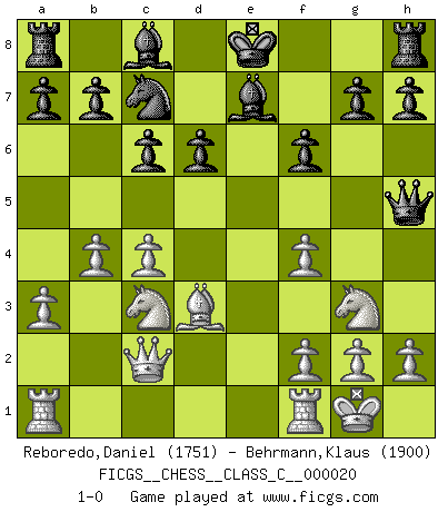 Last move : 1-0 2006 December 23 0:41:24 [Event "FICGS__CHESS__CLASS_C__000020"] [Site "FICGS"] [Date "2006.12.06"] [Round "1"] [White "Reboredo,Daniel"] [Black "Behrmann,Klaus"] [Result "1-0"] [WhiteElo "1751"] [BlackElo "1900"] 1.d4 f5 2.Bg5 Nf6 3.Bxf6 exf6 4.e3 Be7 5.c4 c6 6.Nc3 d6 7.Bd3 Qb6 8.Qc2 f4 9.exf4 Qxd4 10.Nge2 Qc5 11.a3 Qh5 12.O-O Na6 13.b4 Nc7 14.Ng3 1-0 Dutch, 2.Bg5 variation Kingside Castling by player White (move 12) Player White won this chess game. Follow this game move after move (download)One of these modest little moves may be more embarrassing to your opponent than the biggest threat. (Siegbert Tarrasch) Schach ist mein Leben, meine Leidenschaft, was ich gelernt habe und seit meinem 14. Lebensjahr profimässig praktiziere. Darauf zu verzichten, würde mir sehr schwer fallen. (Viktor Kortschnoi) Algunos sacrificios son sólidos, los demás son míos. (Mikhail Tal) Il vaut mieux sacrifier les pièces de l'adversaire. (Xavier Tartacover) Think like a man of action, act like a man of thought. (Henri Louis Bergson)