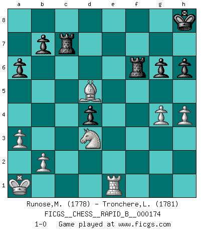 Last move : 1-0 2011 April 16 3:55:44 [Event "FICGS__CHESS__RAPID_B__000174"] [Site "FICGS"] [Date "2011.02.07"] [Round "1"] [White "Runose,Michael"] [Black "Tronchere,Laurent"] [Result "1-0"] [WhiteElo "1778"] [BlackElo "1781"] 1.e4 e6 2.d4 d5 3.Nc3 Nf6 4.Bg5 Be7 5.e5 Nfd7 6.Bxe7 Qxe7 7.f4 O-O 8.Nf3 c5 9.Nb5 Nc6 10.c3 a6 11.Nd6 f6 12.h4 cxd4 13.cxd4 Ndxe5 14.fxe5 fxe5 15.dxe5 Nxe5 16.Nxe5 Qxd6 17.Qd4 Rf5 18.Nd3 e5 19.Qc5 Qg6 20.O-O-O Be6 21.Kb1 Rc8 22.Qd6 d4 23.Ka1 Qe8 24.g4 Rf6 25.Bg2 Bb3 26.Qxe5 Qxe5 27.Nxe5 Bxd1 28.Rxd1 Rc7 29.Nd3 h6 30.Bd5+ Kh8 31.Re1 g6 32.a3 1-0 This chess game has been lost on time (started : 2011.02.07 19:31:48) French : Classical, Steinitz variation Kingside Castling by player Black (move 7) Queenside Castling by player White (move 20) Player White won this chess game. Follow this game move after move (download)Whoever sees no other aim in the game than that of giving checkmate to one's opponent will never become a good Chess player. (Euwe) Ich war schon mal beim Dopingtest. Da musste ich Urin abgeben, während Dritte zusahen. (Elisabeth Pähtz) Los asuntos humanos son como una partida de Ajedrez: solo aquellos que no lo toman seriamente, pueden ser llamados buenos jugadores. (Hung Tzu Ch'eng) Des idées, des idées, j'en ai cent, j'en ai mille. Des bonnes, des mauvaises, applicables, irréalisables... Il suffit de faire le tri ! (Roos) In fact if nothing is done against this teddy bear, hereby I announce that I would quit chess, rapid chess, blitz chess, postal chess, email chess, server chess and correspondence chess I will then switch to a table game where teddy bears aren't going to be seen for a while, like Poker, or Roulette, all 18+ games. (Elmer Valderrama)