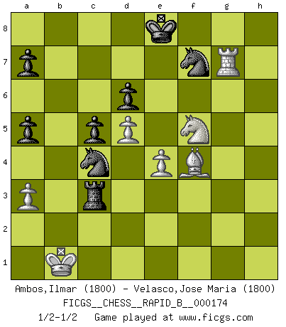 Last move : 1/2-1/2 2011 March 5 19:28:40 [Event "FICGS__CHESS__RAPID_B__000174"] [Site "FICGS"] [Date "2011.02.07"] [Round "1"] [White "Ambos,Ilmar"] [Black "Velasco,Jose Maria"] [Result "1/2-1/2"] [WhiteElo "1800"] [BlackElo "1800"] 1.d4 Nf6 2.g4 Nxg4 3.e4 d6 4.Be2 Nf6 5.Nc3 g6 6.Be3 c6 7.Qd2 Qa5 8.Nf3 Bg4 9.Rg1 Nbd7 10.a3 h6 11.O-O-O Bh5 12.Kb1 Bg7 13.Qe1 O-O-O 14.Nd2 Bxe2 15.Qxe2 Kb8 16.d5 c5 17.f4 h5 18.Nf3 Ng4 19.Bd2 Qa6 20.Qxa6 bxa6 21.h3 Nh6 22.f5 Rdg8 23.fxg6 fxg6 24.Nh4 Bd4 25.Rg2 g5 26.Rxg5 Bf6 27.Rxh5 Nf7 28.Rxh8 Rxh8 29.Nf5 Rxh3 30.Rg1 Nde5 31.Bf4 Kc7 32.Ne2 a5 33.Rg8 Nc4 34.Nxe7 Bxb2 35.c3 Bxc3 36.Nxc3 Kd7 37.Nf5 Rxc3 38.Rg7 Ke8 1/2-1/2 Queen's pawn : Bronstein gambit Queenside Castling by player White (move 11) Queenside Castling by player Black (move 13) This chess game ended in a draw. Follow this game move after move (download)Best by test: 1. e4 (Bobby Fischer) Was ist der Unterschied zwischen einem Strassenarbeiter und einem Schachspieler? --Der Schachspieler bewegt sich ab und zu. (Anonymous) Botvinnik trató de alejar el misterio referente al Ajedrez, siempre relacionandolo a situaciones de la vida diaria. Solía llamar al Ajedrez un problema inexacto típico, similar a aquellos en que la gente tiene siempre que resolver a cada día. (Garry Kasparov) Les Echecs sont et restent toujours un combat, un combat intégral comme la boxe, la lutte ou un autre sport, et où il doit y avoir un vainqueur et un vaincu. (Joseph Emil Diemer) Success without honor is an unseasoned dish; it will satisfy your hunger, but it won't taste good. (Joe Paterno)