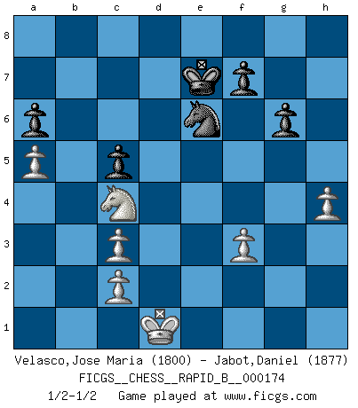 Last move : 1/2-1/2 2011 March 13 11:36:16 [Event "FICGS__CHESS__RAPID_B__000174"] [Site "FICGS"] [Date "2011.02.07"] [Round "1"] [White "Velasco,Jose Maria"] [Black "Jabot,Daniel"] [Result "1/2-1/2"] [WhiteElo "1800"] [BlackElo "1877"] 1.e4 c5 2.Nf3 d6 3.d4 cxd4 4.Nxd4 Nf6 5.Nc3 g6 6.Be3 Bg7 7.f3 O-O 8.Qd2 Nc6 9.O-O-O Bd7 10.g4 Rc8 11.h4 h5 12.gxh5 Nxh5 13.Rg1 Ne5 14.Kb1 Nc4 15.Bxc4 Rxc4 16.Nde2 Kh7 17.Nd5 e6 18.Ndc3 Rc6 19.Nb5 d5 20.exd5 exd5 21.Qxd5 Qe7 22.Qd2 Re6 23.Qxd7 Rxe3 24.Qxe7 Rxe7 25.Nec3 a6 26.Nd6 Bxc3 27.bxc3 Rd8 28.Rd4 R8d7 29.Rgd1 Rc7 30.Kb2 Kg7 31.Rg4 Kf8 32.Rb4 Ng7 33.a4 Ne6 34.a5 Red7 35.Rb6 Rc6 36.Rxc6 bxc6 37.Kc1 Ke7 38.Nc8+ Kd8 39.Nb6 Rxd1+ 40.Kxd1 Ke7 41.Nc4 c5 1/2-1/2 Sicilian : Dragon, Yugoslav attack, 7...O-O Kingside Castling by player Black (move 7) Queenside Castling by player White (move 9) This chess game ended in a draw. Follow this game move after move (download)Chess is the art of analysis. (Mikhail Botvinnik) Kein Schachspieler kann gut schlafen. (H. G. Wells) En la vida, como en el Ajedrez, los Peones propios obstruyen nuestro camino. La gran fortuna de un hombre, su comodidad, placer, hijos, libros, que deberían ayudarle a ganar, con mucha frecuencia lo ponen en Jaque Mate. (Charles Buxton) Les échecs, c'est la lutte contre l'erreur. (Johannes Zukertort) Your best chance to get a Royal Flush in a casino is in the bathroom. (Anonymous)