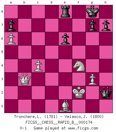 Last move : 0-1 2011 April 17 15:58:12 [Event "FICGS__CHESS__RAPID_B__000174"] [Site "FICGS"] [Date "2011.02.07"] [Round "1"] [White "Tronchere,Laurent"] [Black "Velasco,Jose Maria"] [Result "0-1"] [WhiteElo "1781"] [BlackElo "1800"] 1.d4 Nf6 2.c4 e6 3.Nf3 b6 4.g3 Ba6 5.b3 Bb4+ 6.Bd2 Qe7 7.Bg2 O-O 8.O-O Bb7 9.Nc3 d6 10.a3 Bxc3 11.Bxc3 Nbd7 12.a4 Be4 13.a5 b5 14.Ne1 Bxg2 15.Nxg2 Rab8 16.Qc2 c5 17.dxc5 Nxc5 18.Rfd1 bxc4 19.bxc4 Rfc8 20.Rab1 Nfd7 21.Nf4 Rxb1 22.Rxb1 Qd8 23.Nd3 Ne4 24.Bb4 Qc7 25.f3 Nef6 26.Qb3 e5 27.Rd1 e4 28.Nf4 exf3 29.exf3 Qb7 30.Rxd6 Ne5 31.Kg2 Nxf3 32.a6 Ne1+ 33.Kf2 Qh1 34.Rxf6 Re8 35.Re6 fxe6 36.Bxe1 Qxh2+ 0-1 This chess game has been lost on time (started : 2011.02.07 19:31:48) Queen's Indian : Nimzovich variation (exaggerated Fianchetto) Kingside Castling by player Black (move 7) Kingside Castling by player White (move 8) Player Black won this chess game. Follow this game move after move (download)I feel as if I were a piece in a game of Chess, when my opponent says of it: That piece cannot be moved. (Soren Kierkegaard) Das Schach hält seine Meister in eigenen Banden, Fesseln; auf vielerlei Weise formt es ihren Geist, so dass die innere Freiheit selbst des Stärksten beeinflusst wird. (Albert Einstein) En partidas rápidas, el Caballo es mas poderoso que el Alfil. (Vlastimil Hort) Les échecs sont un jeu par leur forme, un art par leur essence et une science par sa difficulté d'acquisition. Ils peuvent vous procurer autant de plaisir qu'un bon livre ou une belle musique, mais vous n'aurez une réelle joie que si vous arrivez à bien jouer. (Tigran Petrosian) Good decisions come from experience, and experience comes from bad decisions. (Anonymous)