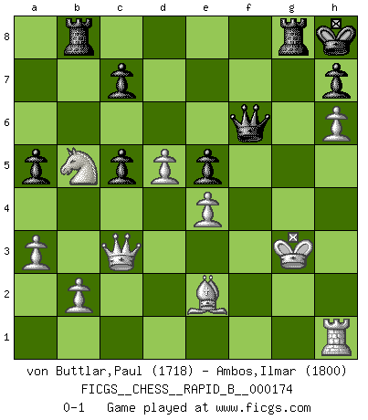 Last move : 0-1 2011 April 10 20:48:20 [Event "FICGS__CHESS__RAPID_B__000174"] [Site "FICGS"] [Date "2011.02.07"] [Round "1"] [White "von Buttlar,Paul"] [Black "Ambos,Ilmar"] [Result "0-1"] [WhiteElo "1718"] [BlackElo "1800"] 1.c4 Nf6 2.Nc3 g6 3.e4 d6 4.d4 Bg7 5.f3 O-O 6.Be3 Nc6 7.Nge2 a6 8.Qd2 Rb8 9.g4 b5 10.h4 bxc4 11.Ng3 e5 12.d5 Nd4 13.Be2 Nd7 14.Na4 a5 15.h5 Rb4 16.h6 Bf6 17.Nc3 Bh4 18.Kf2 f5 19.gxf5 gxf5 20.Rxh4 Qxh4 21.Rh1 Qe7 22.Nxf5 Nxf5 23.exf5 Rxf5 24.Qc2 Rf8 25.a3 Rb8 26.Bxc4 Kh8 27.Be2 Nc5 28.Qd2 Bg4 29.Kg3 Bf5 30.Nb5 Qf6 31.Bxc5 dxc5 32.Qc3 Be4 33.fxe4 Rg8+ 0-1 English Opening Kingside Castling by player Black (move 5) Player Black won this chess game. Follow this game move after move (download)You sit at the board and suddenly your heart leaps. Your hand trembles to pick up the piece and move it. But what Chess teaches you is that you must sit there calmly and think about whether it's really a good idea and whether there are other better ideas. (Stanley Kubrick) Die Partien sind immer verschieden, die Interviews immer die gleichen. (Garry Kasparov) El Ajedrez es un cuento de Hadas de las 1001 metidas de pata. (Savielly Tartakower) Les Echecs, c'est l'art de la guerre sans les charniers, c'est la résurrection des morts tombés au champ d'honneur, l'espoir perpétuel, la suprématie de l'intelligence sur la force, la culture de l'esprit. (F. Szpiner) Man with more than one clock never knows what time it is. (Chinese thought)