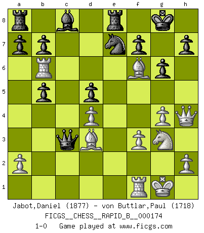 Last move : 1-0 2011 March 22 19:33:39 [Event "FICGS__CHESS__RAPID_B__000174"] [Site "FICGS"] [Date "2011.02.07"] [Round "1"] [White "Jabot,Daniel"] [Black "von Buttlar,Paul"] [Result "1-0"] [WhiteElo "1877"] [BlackElo "1718"] 1.e4 e6 2.d4 d5 3.Nc3 Bb4 4.exd5 exd5 5.Bd3 Ne7 6.Qh5 c6 7.Nge2 Nd7 8.Bg5 Nf8 9.O-O Ne6 10.Bh4 g6 11.Qe5 O-O 12.Qf6 Re8 13.g4 Ng7 14.f3 Qd6 15.Qg5 Ba5 16.Bg3 Qd8 17.Be5 Bc7 18.Bf6 Qd6 19.Ng3 Ne6 20.Qh4 Bb6 21.Rae1 Qb4 22.Nb5 cxb5 23.c3 Qxb2 24.Rxe6 Qxc3 25.Rxb6 1-0 French : Winawer (Nimzovich) variation Kingside Castling by player White (move 9) Kingside Castling by player Black (move 11) Player White won this chess game. Follow this game move after move (download)I know people who have all the will in the world, but still can't play good Chess. (Bobby Fischer) Die Elozahlen sind sehr schlecht für das Schach. Jetzt ist Schach eine Sportindustrie, die darauf zielt Elopunkte zu machen. (Miguel Najdorf) El estómago es una parte esencial del maestro de Ajedrez. (Bent Larsen) Toutes choses étant égales, c'est la conviction qui gagne. Alliée à une volonté de vaincre, elle sert de détonateur, suscite des idées, disperse les doutes et aide à penser clairement. (Robert Fischer) There will be no order, only chaos. (Sol Robeson in Pi by Darren Aronofsky)