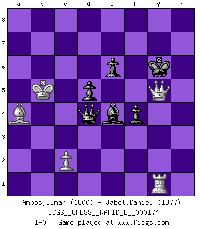 Last move : 1-0 2011 June 19 15:51:23 [Event "FICGS__CHESS__RAPID_B__000174"] [Site "FICGS"] [Date "2011.02.07"] [Round "1"] [White "Ambos,Ilmar"] [Black "Jabot,Daniel"] [Result "1-0"] [WhiteElo "1800"] [BlackElo "1877"] 1.Nf3 c5 2.Nc3 Nc6 3.e4 g6 4.d4 cxd4 5.Nxd4 Bg7 6.Be3 Nf6 7.Bc4 O-O 8.Bb3 d6 9.f3 Bd7 10.g4 Rc8 11.h4 Ne5 12.h5 Rxc3 13.bxc3 Qa5 14.Bd2 Nxe4 15.fxe4 Bxg4 16.Qc1 Nf3+ 17.Nxf3 Bxf3 18.Kf2 Bxe4 19.Rh4 d5 20.Qe1 e6 21.Kg1 Qc7 22.hxg6 hxg6 23.Qe3 Rc8 24.Rf1 Bf8 25.Qf2 Bd6 26.Bf4 Bxf4 27.Rxf4 Qe7 28.Qg3 Rxc3 29.Qxc3 Qg5+ 30.Kf2 Qxf4+ 31.Ke1 Qg5 32.Kd1 b5 33.a4 Qg2 34.Ke1 a6 35.axb5 axb5 36.Qc8+ Kg7 37.Qc7 Bf5 38.Qe5+ f6 39.Qc7+ Kh6 40.Qc3 Kg7 41.Qd4 Qh3 42.Rg1 Be4 43.Kd2 Qh6+ 44.Kc3 g5 45.Kb4 Kg6 46.Kxb5 Qh8 47.Qb6 Qh2 48.Qc5 f5 49.Qb6 Qe5 50.Qd8 f4 51.Ba4 Qd4 52.Qxg5+ 1-0 Reti Opening Kingside Castling by player Black (move 7) Player White won this chess game. Follow this game move after move (download)When you don't know what to do, wait for your opponent to get an idea - it's sure to be wrong. (Tarrasch) Die starken Figuren des Gegners muss man abtauschen. (José Raúl Capablanca) El Ajedrez, como la música, como el amor, tiene el poder de hacer feliz a la gente. (Siegbert Tarrasch) Si rien de grave n'est détecté lors de l'analyse d'une position, on joue alors le coup. Seconde règle de Blumenfeld. It's not a bug - it's an undocumented feature. (Anonymous)